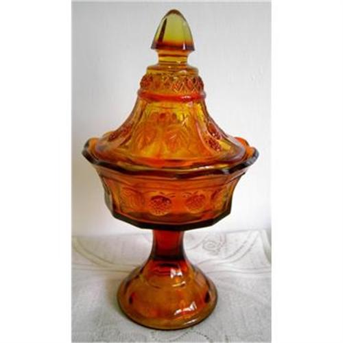 The gold to red amberina color enhances the strawberries and leaves on the covered candy dish from Tiara Exclusives. Approx. 9"Hx5"W; no label or mark. In very fine condition, there is one chip on the edge of the cover. PAYPAL Accepted,debit cards accepted. USD Only.