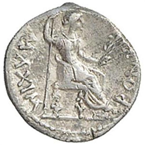 Impero Romano. Tiberio (14-37). Denario. D/ TI CAESAR DIVI AVG F AVGVSTVS. Testa laureata a destra. R/ PONTIF MAXIM. Livia, come Pax, seduta a destra, tiene scettro e ramo d'olivo. RIC 30. gr. 3.69 AG. BB. Delicata patina di monetiere.