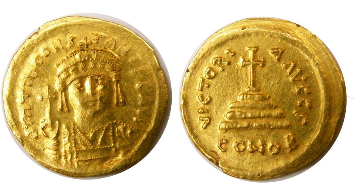 Tiberius II Constantine, 578-582, Obv, Facing image of Tiberius II with crown, holding globus with c