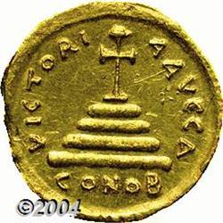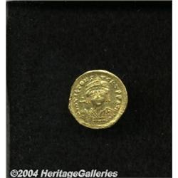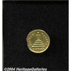 <B>Tiberius II Constantine.</B></I> A.D. 578-582. AV solidus (20 mm, 4.36 g). Constantinople, A.D. 579-582. Crowned and cuirassed bust facing, holding globus cruciger and shield decorated with a horseman spearing fallen enemy / Cross potent on four steps; A/CONOB. DOC 4a; SB 422. XF, soft obverse strike, light scratches. <BR><I>From the Geneva Collection.</B></I> <BR><BR><B>Important notice:</B> Heritage usually auctions material at the rate of 200-250 lots per hour. On some occasions eBay Live bid software or the Internet may not be able to keep up with the pace of the auction. We recommend placing a realistic absentee bid now as insurance to avoid disappointment. Occasionally the auctioneer may eliminate or reject an eBay Live bid, and the auctioneer may also reopen a lot after the close of the eBay live bidding (usually because we missed an audience bid), and may reject your bid even if it shows you as the winning bidder. By bidding via eBay Live, you agree that Heritage may award the lot to another bidder at its sole discretion under the circumstances described above or any other reasonable circumstances. Since eBay bids are not shown to us until we open the lot on the floor, we treat those bids just like floor bids. In most cases the floor responds before the eBay bid is presented to us, due to Internet lag time, so for consistency we have made it a policy that floor bids are always considered first over tie eBay live bids. Also please note that all Heritage lots purchased through eBay Live carry a 20% Buyer's Premium. Please make sure you read the Terms and Conditions before you bid.