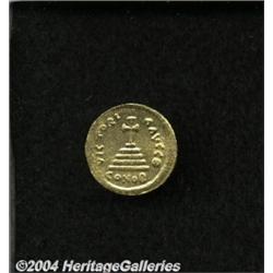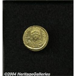 <B>Tiberius II Constantine.</B></I> A.D. 578-582. AV solidus (21 mm, 4.44 g). Constantinople, A.D. 579-582. Crowned and cuirassed bust facing, holding globus cruciger and shield decorated with a horseman spearing fallen enemy / Cross potent on four steps; (Theta)/CONOB. DOC 4i; SB 422. Good VF. <BR><I>From the Geneva Collection.</B></I> <BR><BR><B>Important notice:</B> Heritage usually auctions material at the rate of 200-250 lots per hour. On some occasions eBay Live bid software or the Internet may not be able to keep up with the pace of the auction. We recommend placing a realistic absentee bid now as insurance to avoid disappointment. Occasionally the auctioneer may eliminate or reject an eBay Live bid, and the auctioneer may also reopen a lot after the close of the eBay live bidding (usually because we missed an audience bid), and may reject your bid even if it shows you as the winning bidder. By bidding via eBay Live, you agree that Heritage may award the lot to another bidder at its sole discretion under the circumstances described above or any other reasonable circumstances. Since eBay bids are not shown to us until we open the lot on the floor, we treat those bids just like floor bids. In most cases the floor responds before the eBay bid is presented to us, due to Internet lag time, so for consistency we have made it a policy that floor bids are always considered first over tie eBay live bids. Also please note that all Heritage lots purchased through eBay Live carry a 20% Buyer's Premium. Please make sure you read the Terms and Conditions before you bid.