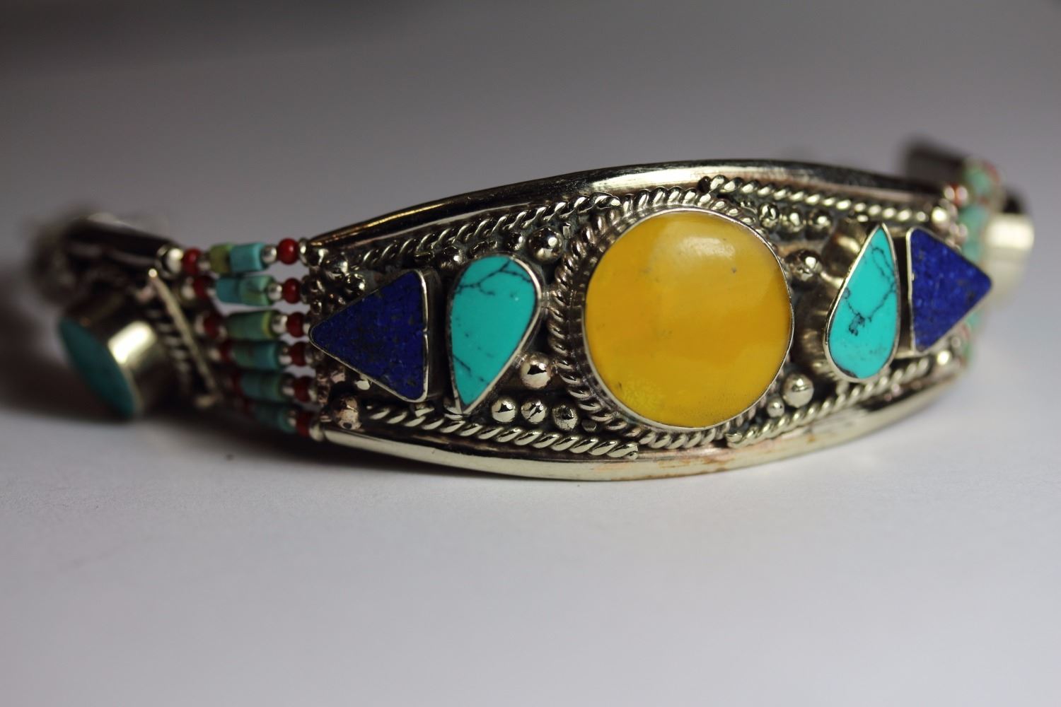 Tibet Natural Stone Hand Made Turquoise, Coral Bracelet.......This elegant large Bracelet was handcrafted in Tibet, the home of exquisite jewelry craftsmanship. It was skillfully made with natural Turquoise, each in a deep Tibetan Silver setting. and balance the design perfectly. Turquoise is used virtually worldwide for jewelry making, and is highly prized for its brilliant colors, which vary from mine to mine. The distinctive webbing patterns and variations of color in the stones on this wonderful piece are typical of the natural Turquoise found throughout much of the Himalayan region, where Turquoise has been used in jewelry-making since centuries.”””Note- All stones in this Bracelet are Natural.....Guranteed....Vintage look but Bracelet is brand new.