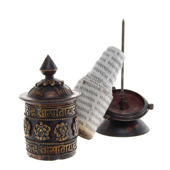 Excellent unusual vintage piece on stand with prayer scroll remaining inside, Buddhist Monks spin these while chanting during temple prayer, 5.5"