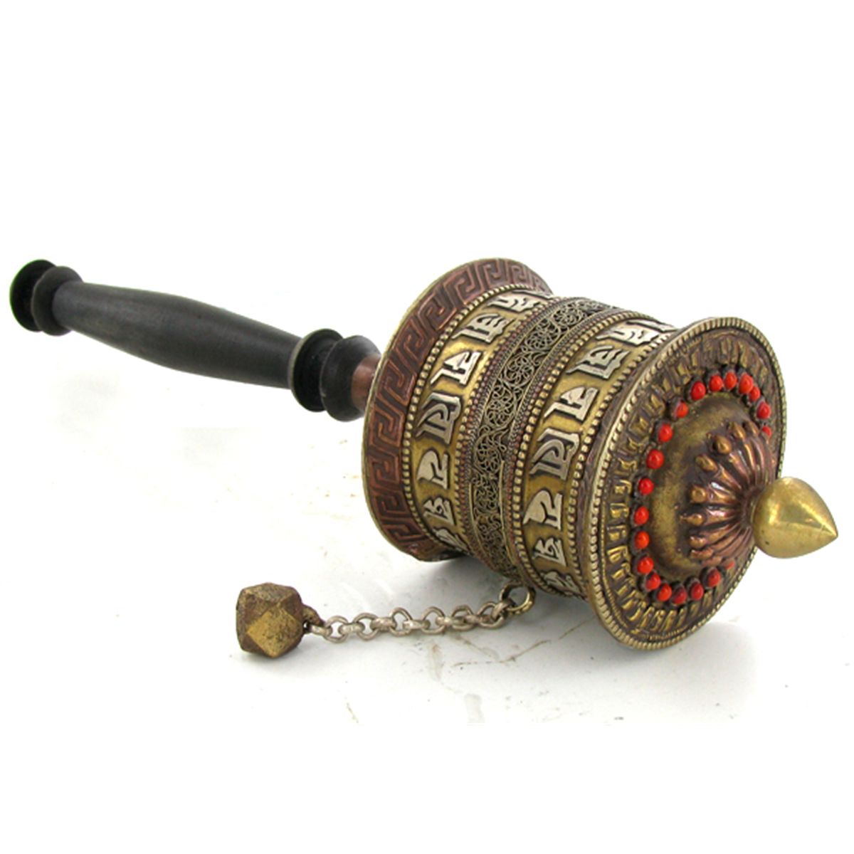 Excellent vintage piece with handle prayer scroll remaining inside, Buddhist Monks spin these while chanting during temple prayer, semi-precious stones, 11"