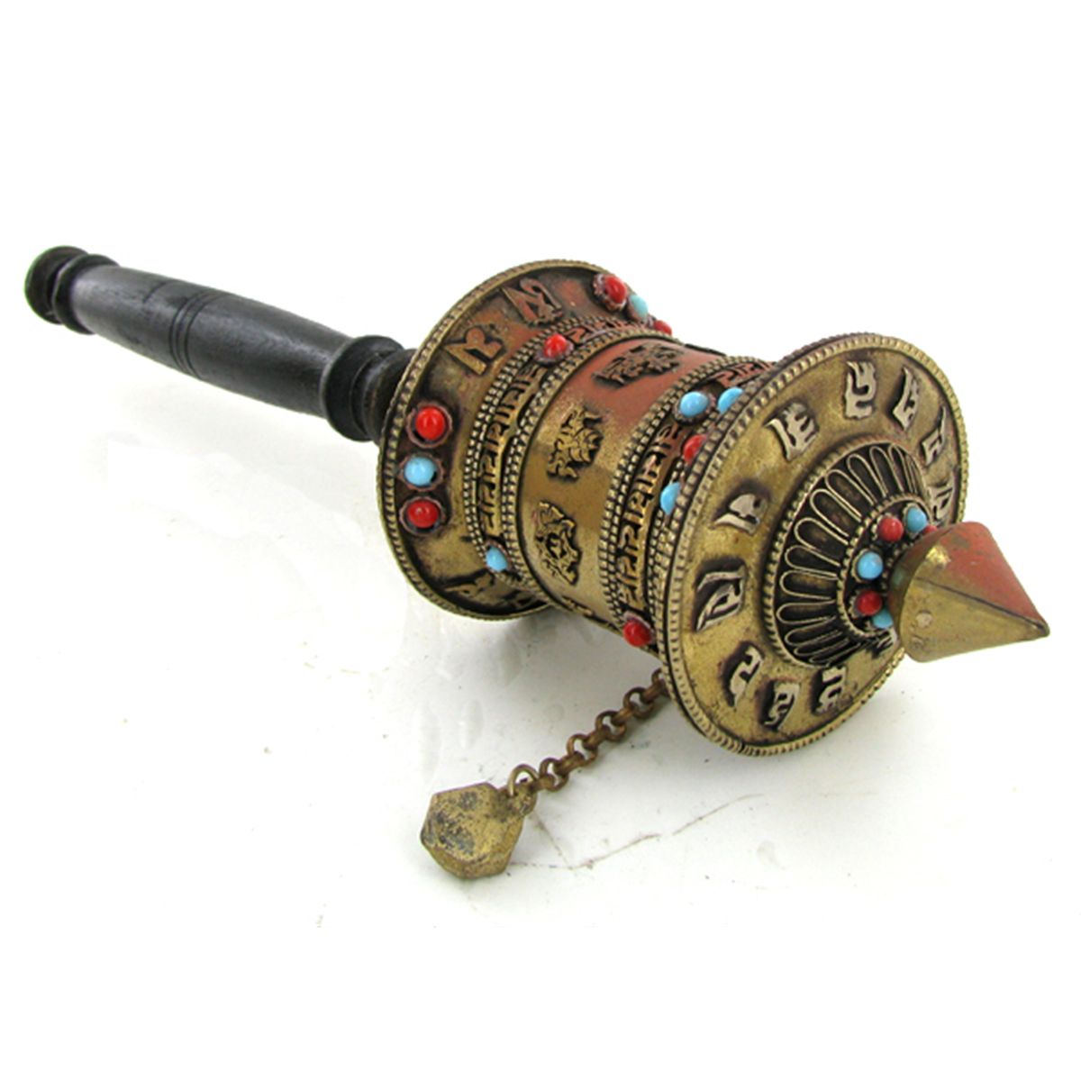 Excellent vintage piece with handle prayer scroll remaining inside, Buddhist Monks spin these while chanting during temple prayer, semi-precious stones, 12"