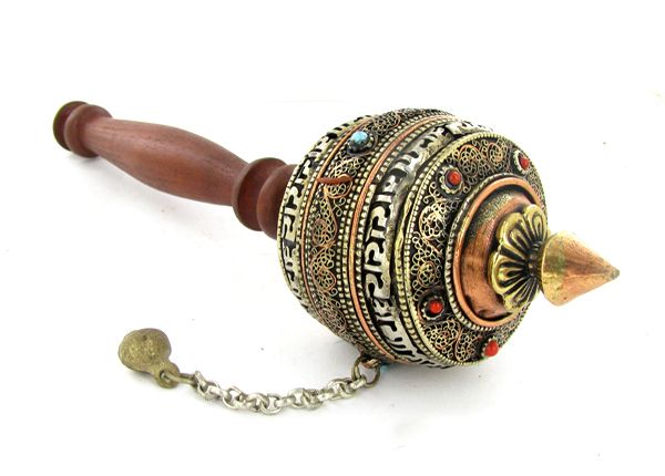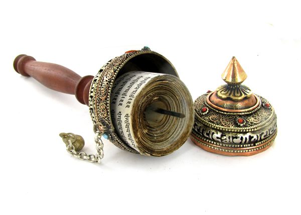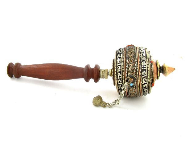 Excellent vintage piece with handle prayer scroll remaining inside, Buddhist Monks spin these while chanting during temple prayer, semi-precious stones, 10"