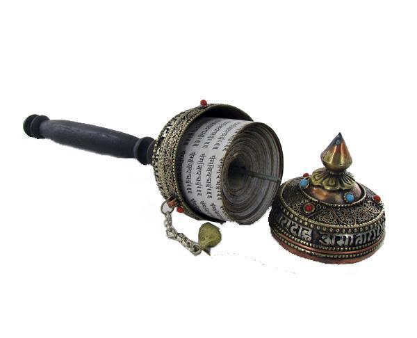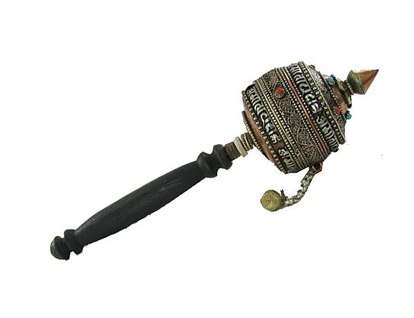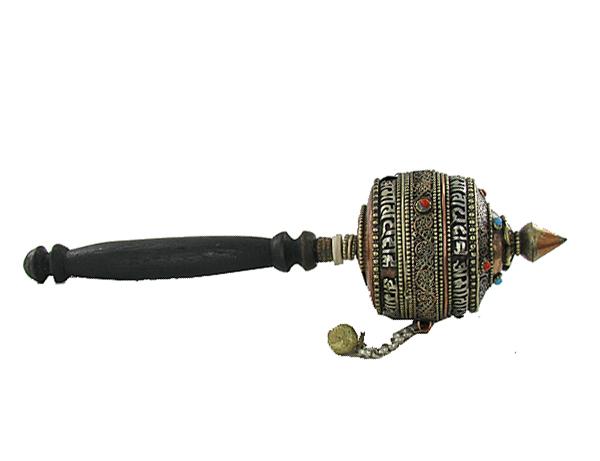 Excellent vintage piece with handle prayer scroll remaining inside, Buddhist Monks spin these while chanting during temple prayer, semi-precious stones, 10"