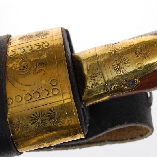 Excellent piece with steel blade teak handle and gold plated scarab ornaments, 12"