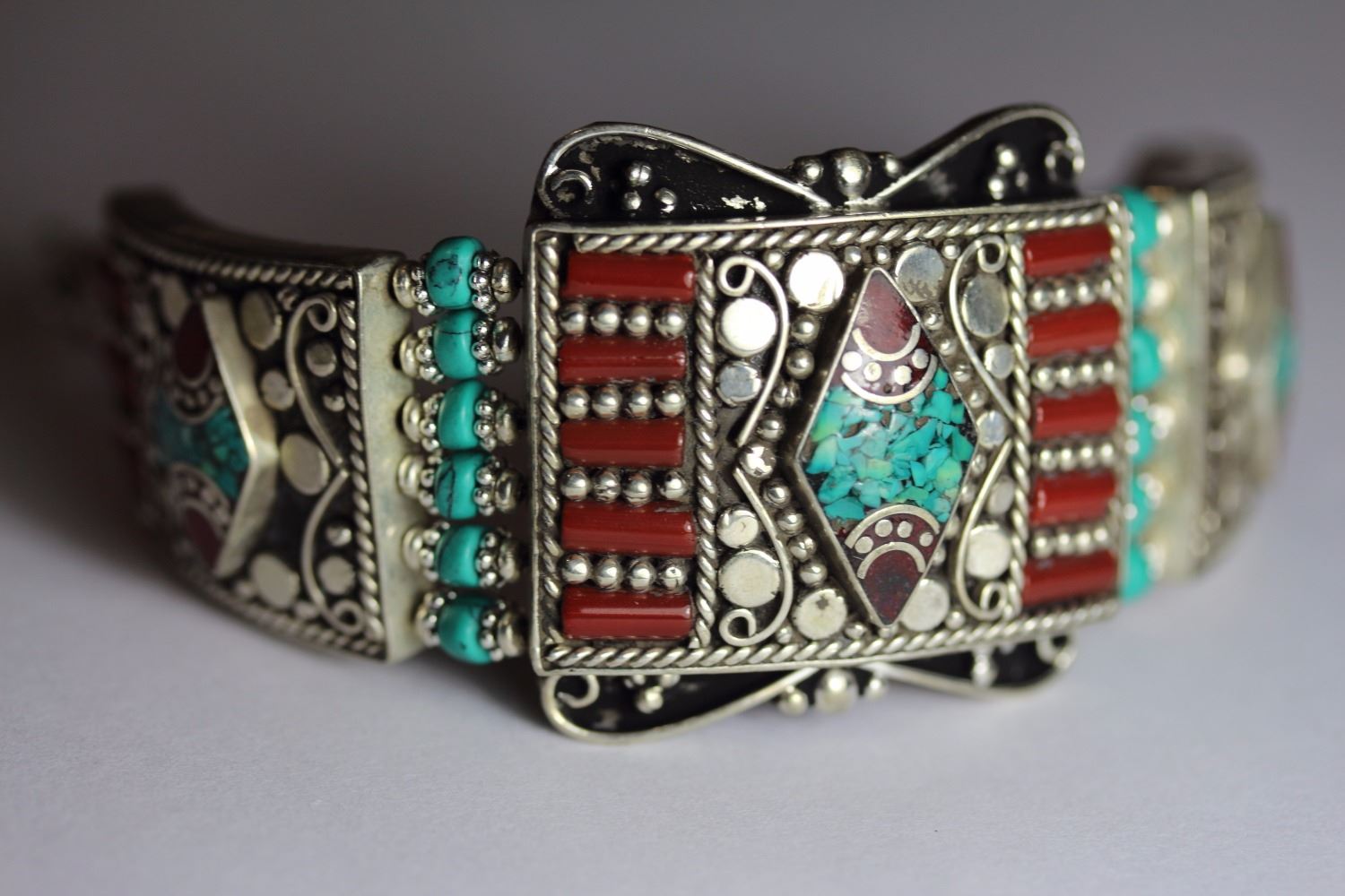 Tibet Natural Stone Hand Made Coral & Turquoise Bracelet.......This elegant large Bracelet was handcrafted in Tibet, the home of exquisite jewelry craftsmanship. It was skillfully made with natural coral & Turquoise, each in a deep Tibetan Silver setting. and balance the design perfectly. The distinctive webbing patterns and variations of color in the stones on this wonderful piece are typical of the natural Turquoise found throughout much of the Himalayan region, where Turquoise has been used in jewelry-making since centuries.”””Note- All stones in this Bracelet are Natural.....Guranteed....Vintage look but Bracelet is brand new.