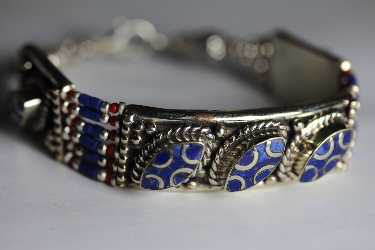 Tibet Natural Stone Hand Made Lapiz Lazuli Bracelet.......This elegant large Bracelet was handcrafted in Tibet, the home of exquisite jewelry craftsmanship. It was skillfully made with natural Lapiz Lazuli, each in a deep Tibetan Silver setting. and balance the design perfectly. Lapiz Lazuli is used virtually worldwide for jewelry making, and is highly prized for its brilliant colors, which vary from mine to mine.