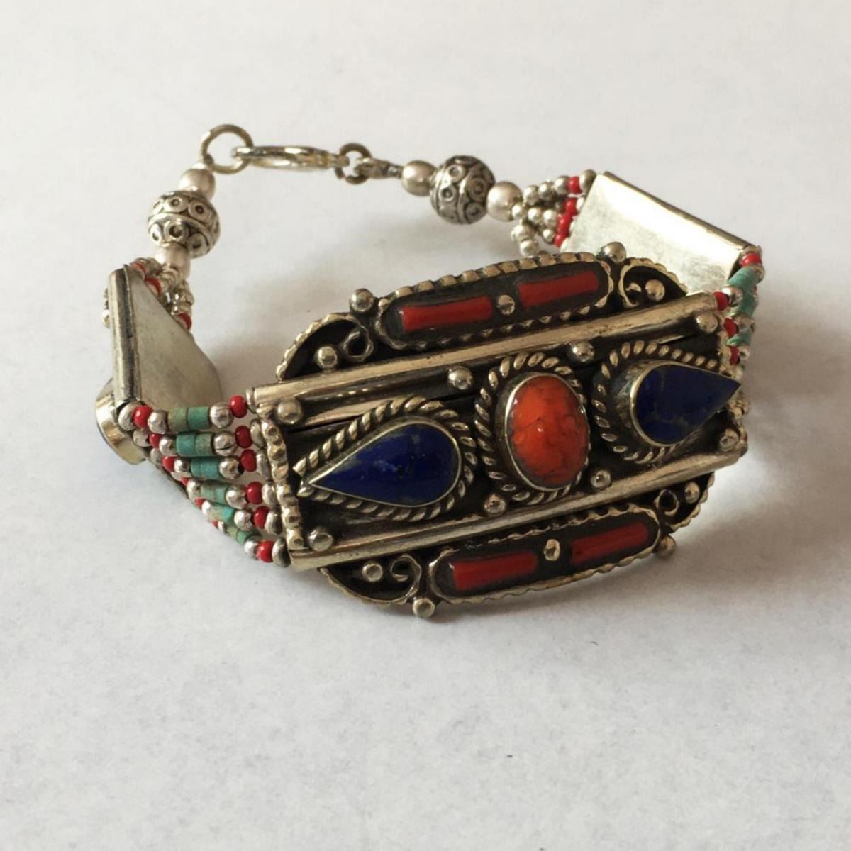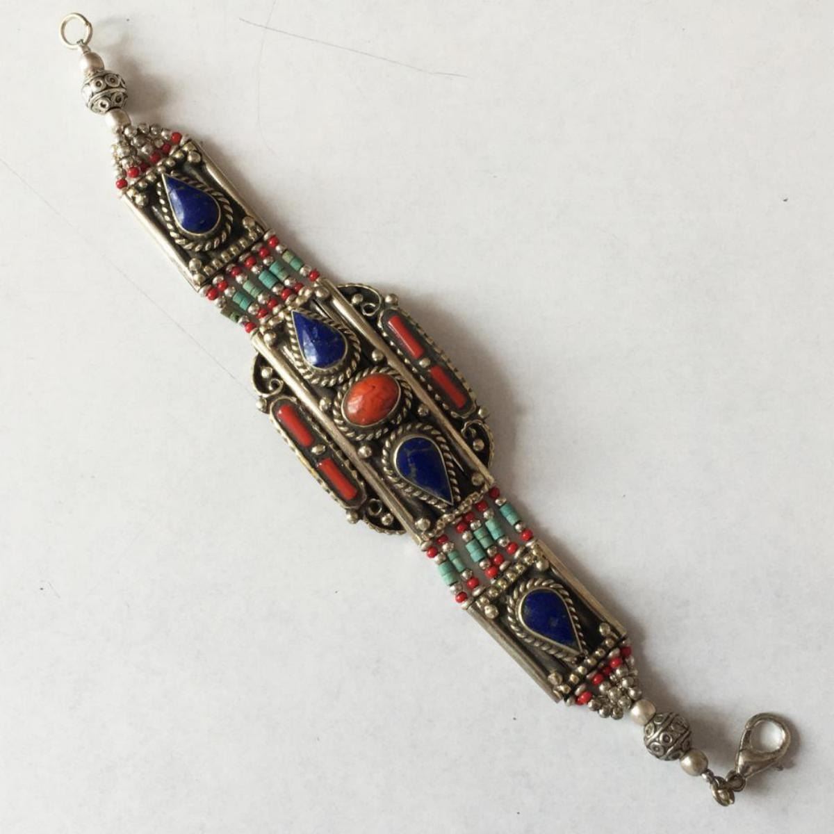 Tibet Natural Stone Hand Made lapiz lazuli Bracelet.......This elegant large Bracelet was handcrafted in Tibet, the home of exquisite jewelry craftsmanship. It was skillfully made with natural Lapiz Lazuli, each in a deep Tibetan Silver setting. and balance the design perfectly. Turquoise is used virtually worldwide for jewelry making, and is highly prized for its brilliant colors, which vary from mine to mine. The distinctive webbing patterns and variations of color in the stones .”””Note- All stones in this Bracelet are Natural.....Guaranteed....Vintage look but Bracelet is brand new.