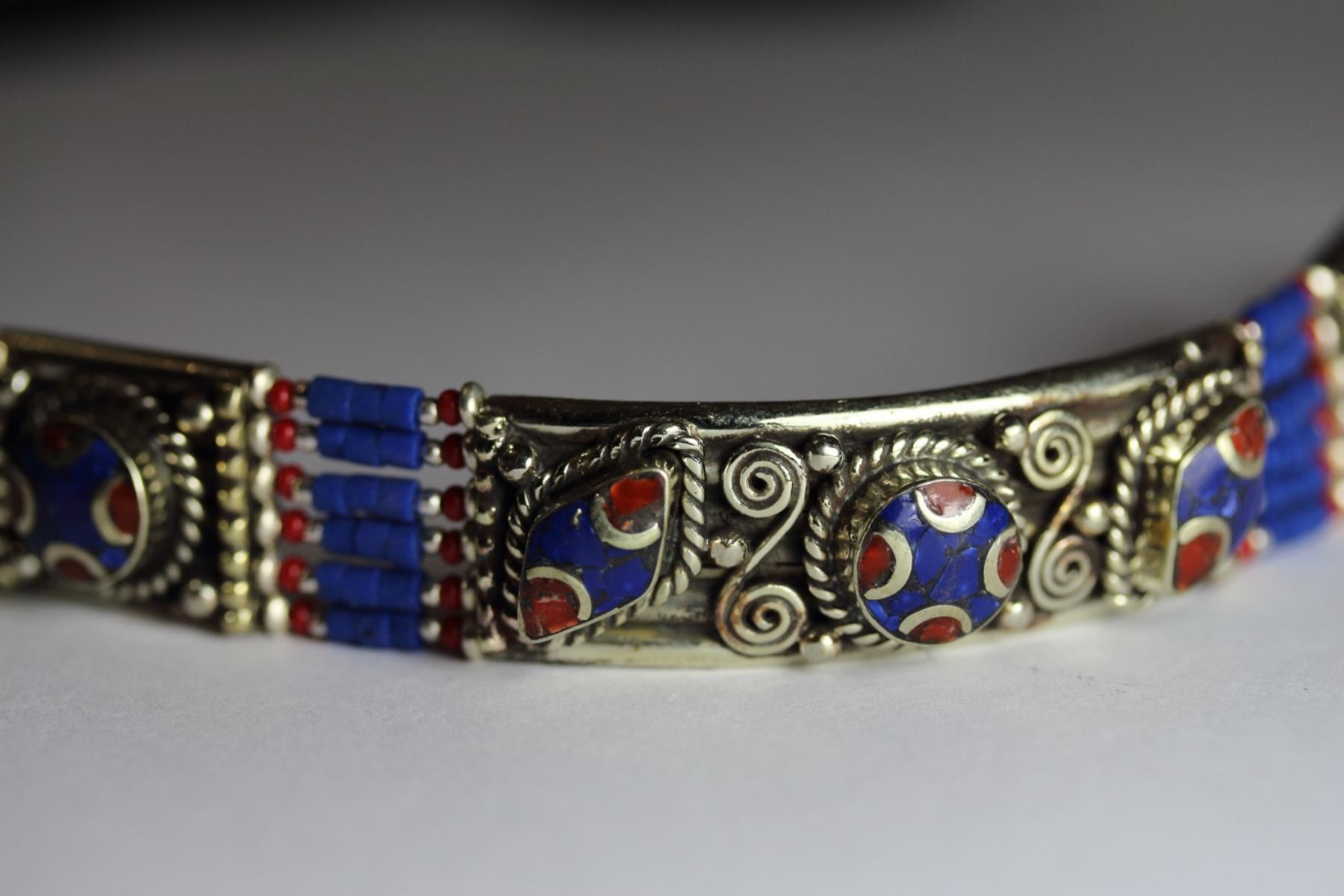 Tibet Natural Stone Hand Made lapiz lazuli, Coral Bracelet.......This elegant large Bracelet was handcrafted in Tibet, the home of exquisite jewelry craftsmanship. It was skillfully made with natural coral, each in a deep Tibetan Silver setting. and balance the design perfectly. Turquoise is used virtually worldwide for jewelry making, and is highly prized for its brilliant colors, which vary from mine to mine. The distinctive webbing patterns and variations of color in the stones .”””Note- All stones in this Bracelet are Natural.....Guranteed....Vintage look but Bracelet is brand new.