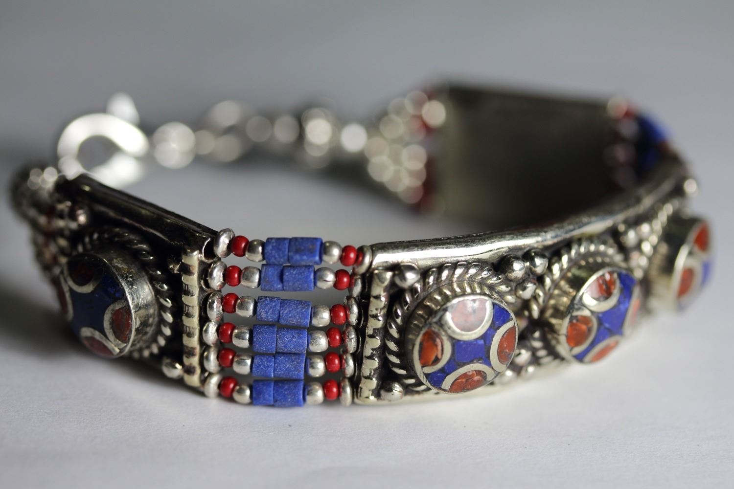 Tibet Natural Stone Hand Made lapiz lazuli, Coral Bracelet.......This elegant large Bracelet was handcrafted in Tibet, the home of exquisite jewelry craftsmanship. It was skillfully made with natural coral, each in a deep Tibetan Silver setting. and balance the design perfectly. Coral is used virtually worldwide for jewelry making, and is highly prized for its brilliant colors, which vary from mine to mine. The distinctive webbing patterns and variations of color in the stones .”””Note- All stones in this Bracelet are Natural.....Guaranteed....Vintage look but Bracelet is brand new.