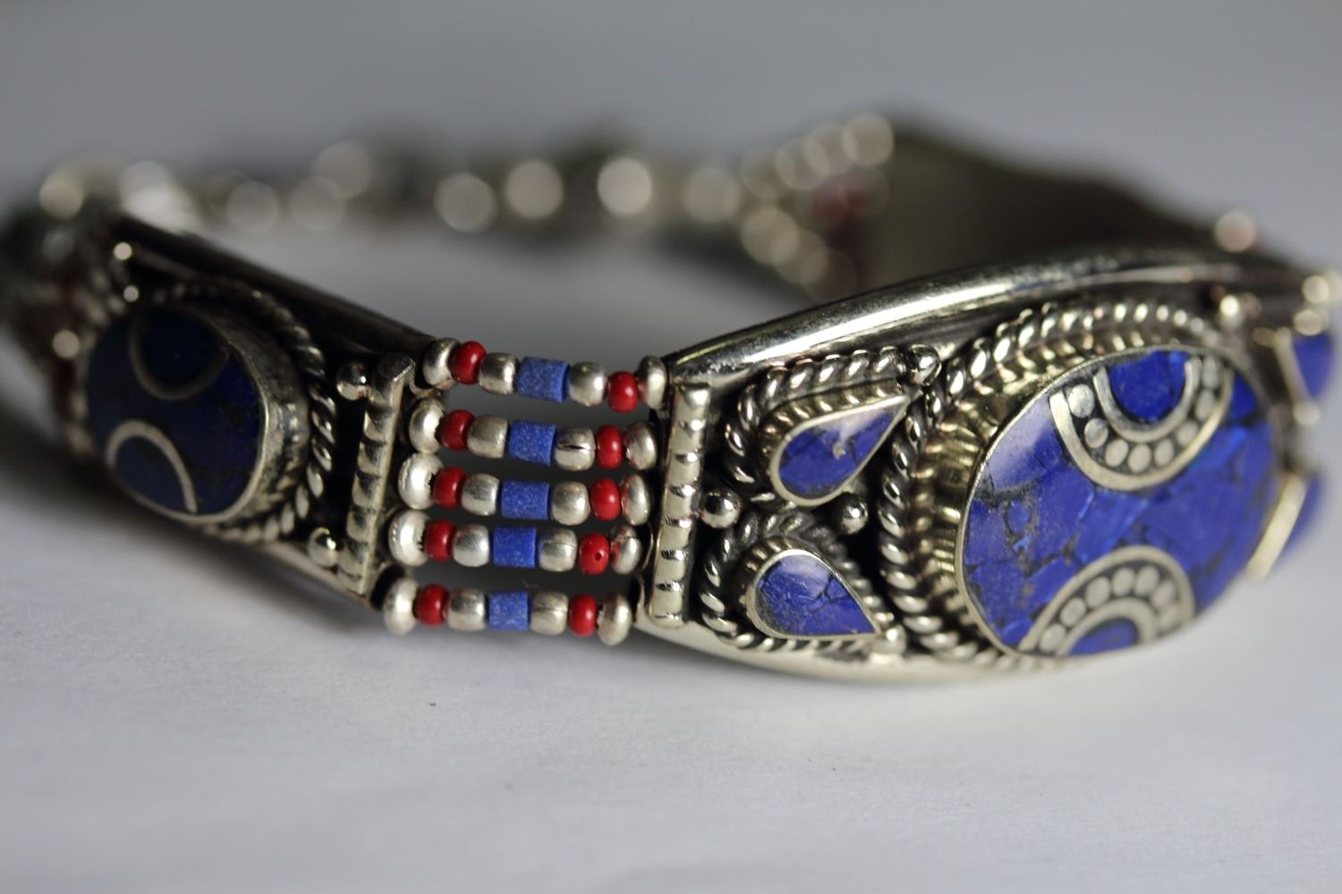 Tibet Natural Stone Hand Made lapiz lazuli, Coral Bracelet.......This elegant large Bracelet was handcrafted in Tibet, the home of exquisite jewelry craftsmanship. It was skillfully made with natural coral, each in a deep Tibetan Silver setting. and balance the design perfectly. Coral is used virtually worldwide for jewelry making, and is highly prized for its brilliant colors, which vary from mine to mine. The distinctive webbing patterns and variations of color in the stones .”””Note- All stones in this Bracelet are Natural.....Guaranteed....Vintage look but Bracelet is brand new.