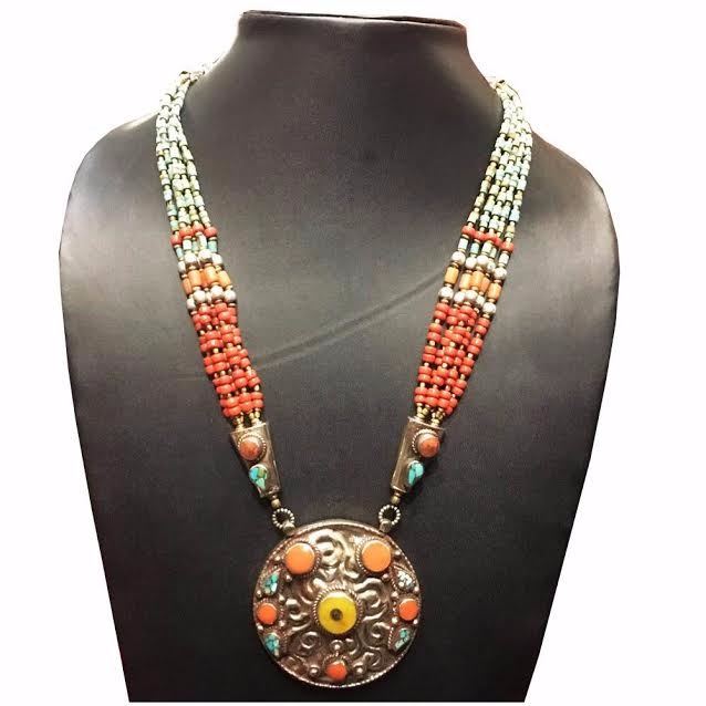 Tibet Natural Stone Hand Made Turquoise, Coral Necklace.......;This elegant large Necklace was handcrafted in Tibet, the home of exquisite jewelry craftsmanship. It was skillfully made with large natural Turquoise, each in a deep Tibetan Silver setting. and balance the design perfectly. Turquoise is used virtually worldwide for jewelry making, and is highly prized for its brilliant colors, which vary from mine to mine. The distinctive webbing patterns and variations of color in the stones on this wonderful piece are typical of the natural Turquoise found throughout much of the Himalayan region, where Turquoise has been used in jewelry-making since centuries.”””Note- All stones in this necklace are Natural.....Guranteed....Vintage look but necklace is brand new.Condition