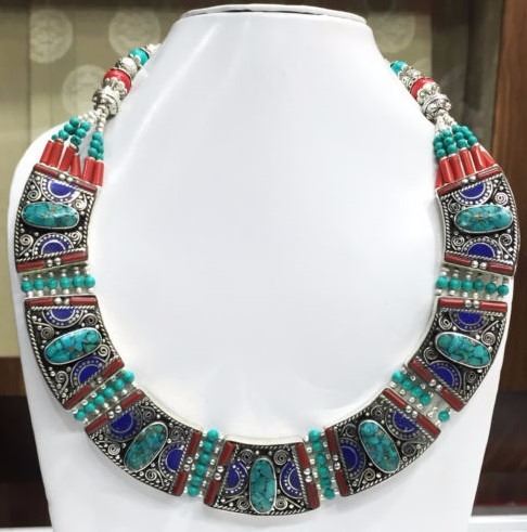 Tibet Hand Made Natural Coral, Lapis Lazuli Necklace.....This elegant large Necklace was handcrafted in Tibet, the home of exquisite jewelry craftsmanship. It was skillfully made with large natural stones, each in a deep Tibetan Silver setting. and balance the design perfectly. Coral & Lapis are used virtually worldwide for jewelry making, and is highly prized for its brilliant colors, Note- All stones in this necklace are Natural.....Guranteed....Vintage look but necklace is brand new.