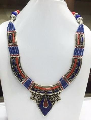 Tibet Hand Made Natural Coral, Lapis Lazuli Necklace.....This elegant large Necklace was handcrafted in Tibet, the home of exquisite jewelry craftsmanship. It was skillfully made with large natural stones, each in a deep Tibetan Silver setting. and balance the design perfectly. Coral & Lapis are used virtually worldwide for jewelry making, and is highly prized for its brilliant colors, Note- All stones in this necklace are Natural.....Guranteed....Vintage look but necklace is brand new.