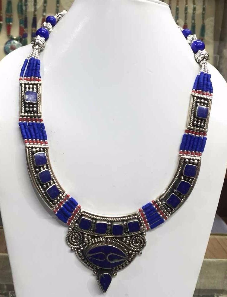Tibet Hand Made Natural Coral, Lapis Lazuli Necklace.....This elegant large Necklace was handcrafted in Tibet, the home of exquisite jewelry craftsmanship. It was skillfully made with large natural stones, each in a deep Tibetan Silver setting. and balance the design perfectly. Coral & Lapis are used virtually worldwide for jewelry making, and is highly prized for its brilliant colors, Note- All stones in this necklace are Natural.....Guranteed....Vintage look but necklace is brand new.