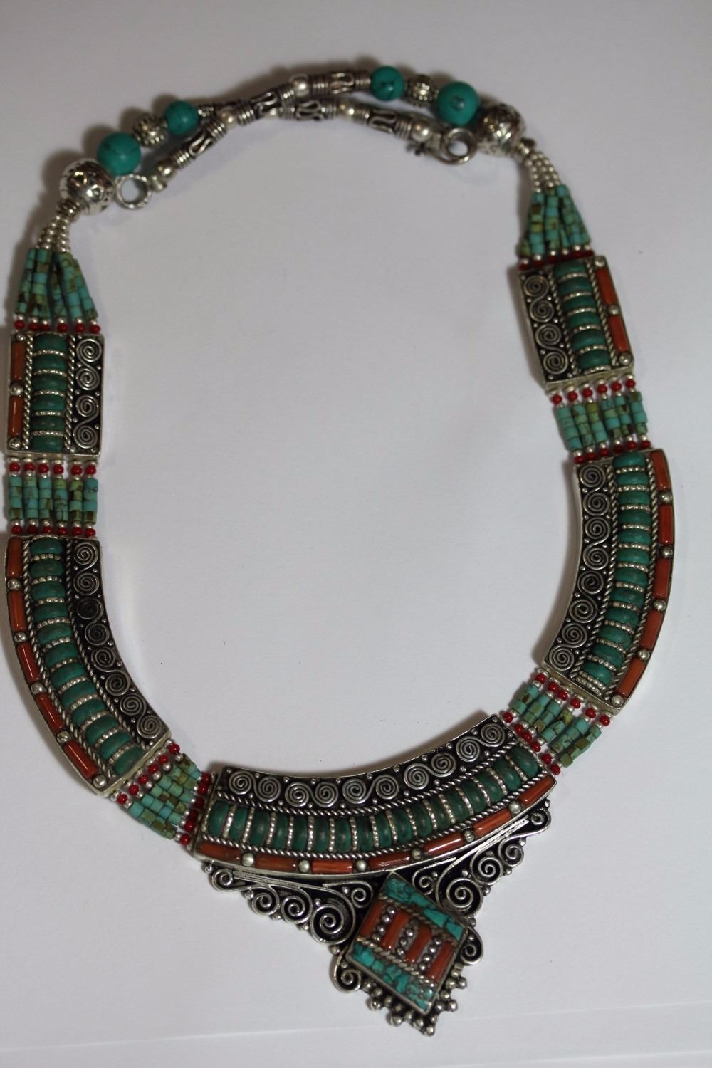 Tibet Natural Stone Hand Made Turquoise, Coral Necklace......;This elegant large Necklace was handcrafted in Tibet, the home of exquisite jewelry craftsmanship. It was skillfully made with large natural Turquoise, each in a deep Tibetan Silver setting. and balance the design perfectly. Turquoise is used virtually worldwide for jewelry making, and is highly prized for its brilliant colors, which vary from mine to mine. The distinctive webbing patterns and variations of color in the stones on this wonderful piece are typical of the natural Turquoise found throughout much of the Himalayan region, where Turquoise has been used in jewelry-making since centuries.”””Note- All stones in this necklace are Natural.....Guranteed....Vintage look but necklace is brand new.