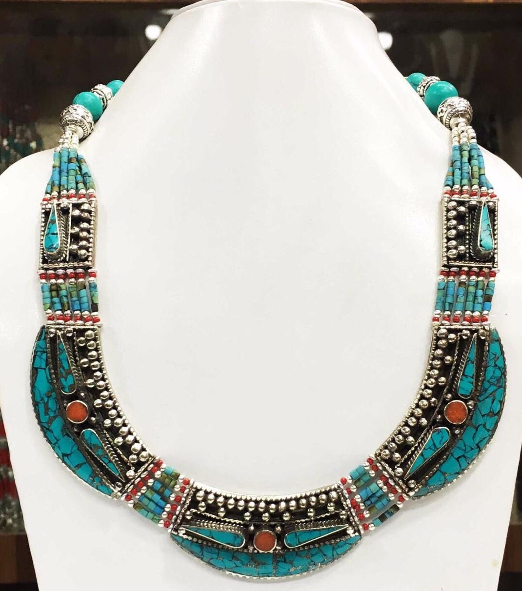 Tibet Natural Stone Hand Made Turquoise, Coral Necklace......;This elegant large Necklace was handcrafted in Tibet, the home of exquisite jewelry craftsmanship. It was skillfully made with large natural Turquoise, each in a deep Tibetan Silver setting. and balance the design perfectly. Turquoise is used virtually worldwide for jewelry making, and is highly prized for its brilliant colors, which vary from mine to mine. The distinctive webbing patterns and variations of color in the stones on this wonderful piece are typical of the natural Turquoise found throughout much of the Himalayan region, where Turquoise has been used in jewelry-making since centuries.