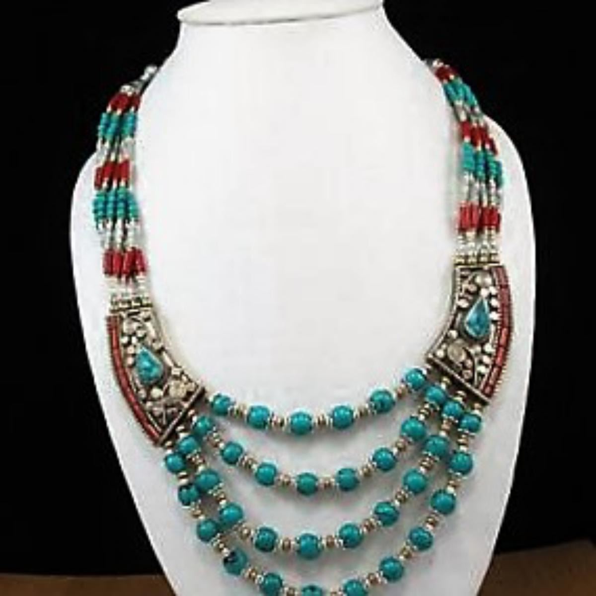 Tibet Natural Stone Hand Made Turquoise, Coral Necklace......;This elegant large Necklace was handcrafted in Tibet, the home of exquisite jewelry craftsmanship. It was skillfully made with large natural Turquoise, each in a deep Tibetan Silver setting. and balance the design perfectly. Turquoise is used virtually worldwide for jewelry making, and is highly prized for its brilliant colors, which vary from mine to mine. The distinctive webbing patterns and variations of color in the stones on this wonderful piece are typical of the natural Turquoise found throughout much of the Himalayan region, where Turquoise has been used in jewelry-making since centuries.”””Note- All stones in this necklace are Natural.....Guranteed....Vintage look but necklace is brand new.