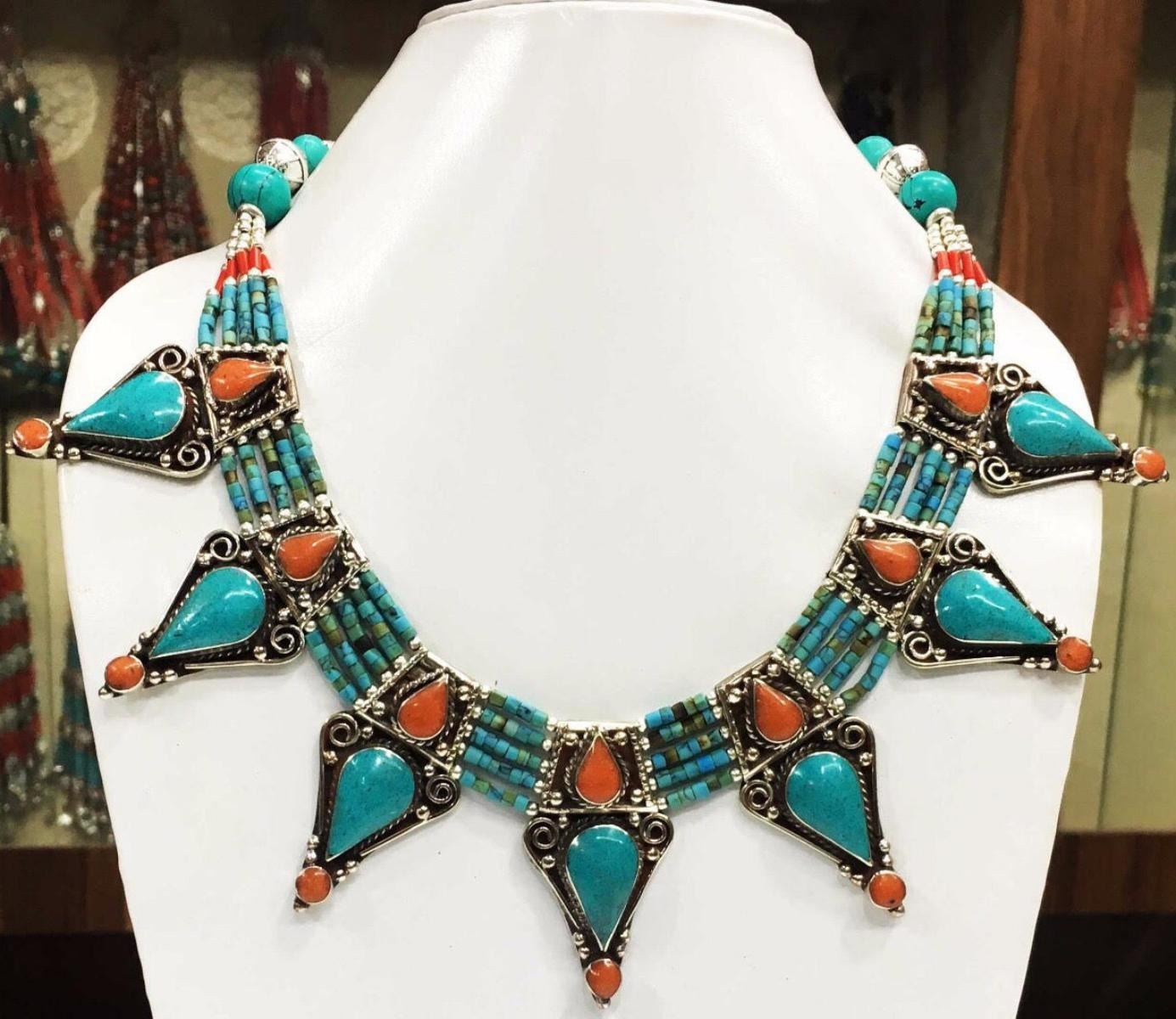 Tibet Natural Stone Hand Made Turquoise, Coral Necklace......;This elegant large Necklace was handcrafted in Tibet, the home of exquisite jewelry craftsmanship. It was skillfully made with large natural Turquoise, each in a deep Tibetan Silver setting. and balance the design perfectly. Turquoise is used virtually worldwide for jewelry making, and is highly prized for its brilliant colors, which vary from mine to mine. The distinctive webbing patterns and variations of color in the stones on this wonderful piece are typical of the natural Turquoise found throughout much of the Himalayan region, where Turquoise has been used in jewelry-making since centuries.”””Note- All stones in this necklace are Natural.....Guranteed....Vintage look but necklace is brand new.
