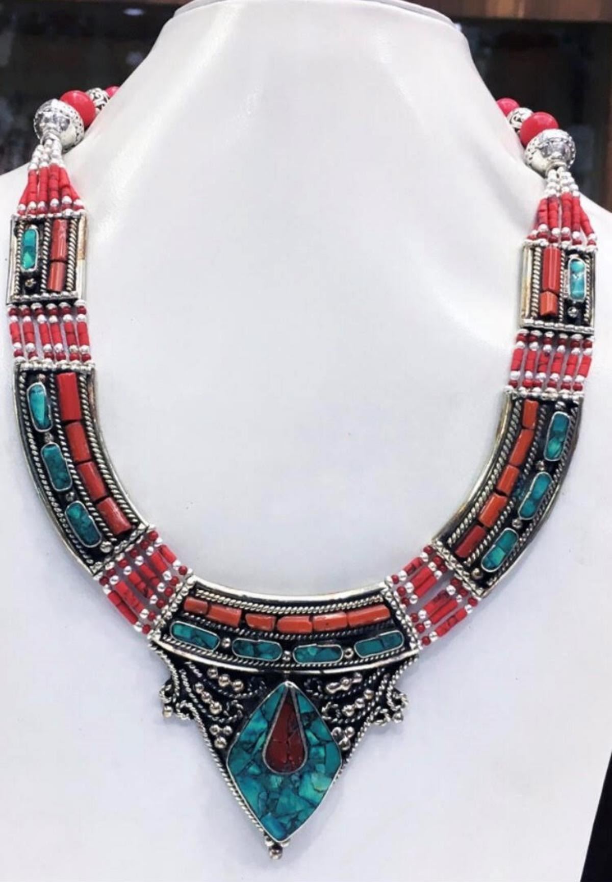 Tibet Natural Stone Hand Made Turquoise, Coral Necklace......;This elegant large Necklace was handcrafted in Tibet, the home of exquisite jewelry craftsmanship. It was skillfully made with large natural Turquoise, each in a deep Tibetan Silver setting. and balance the design perfectly. Turquoise is used virtually worldwide for jewelry making, and is highly prized for its brilliant colors, which vary from mine to mine. The distinctive webbing patterns and variations of color in the stones on this wonderful piece are typical of the natural Turquoise found throughout much of the Himalayan region, where Turquoise has been used in jewelry-making since centuries.”””Note- All stones in this necklace are Natural.....Guaranteed....Vintage look but necklace is brand new.