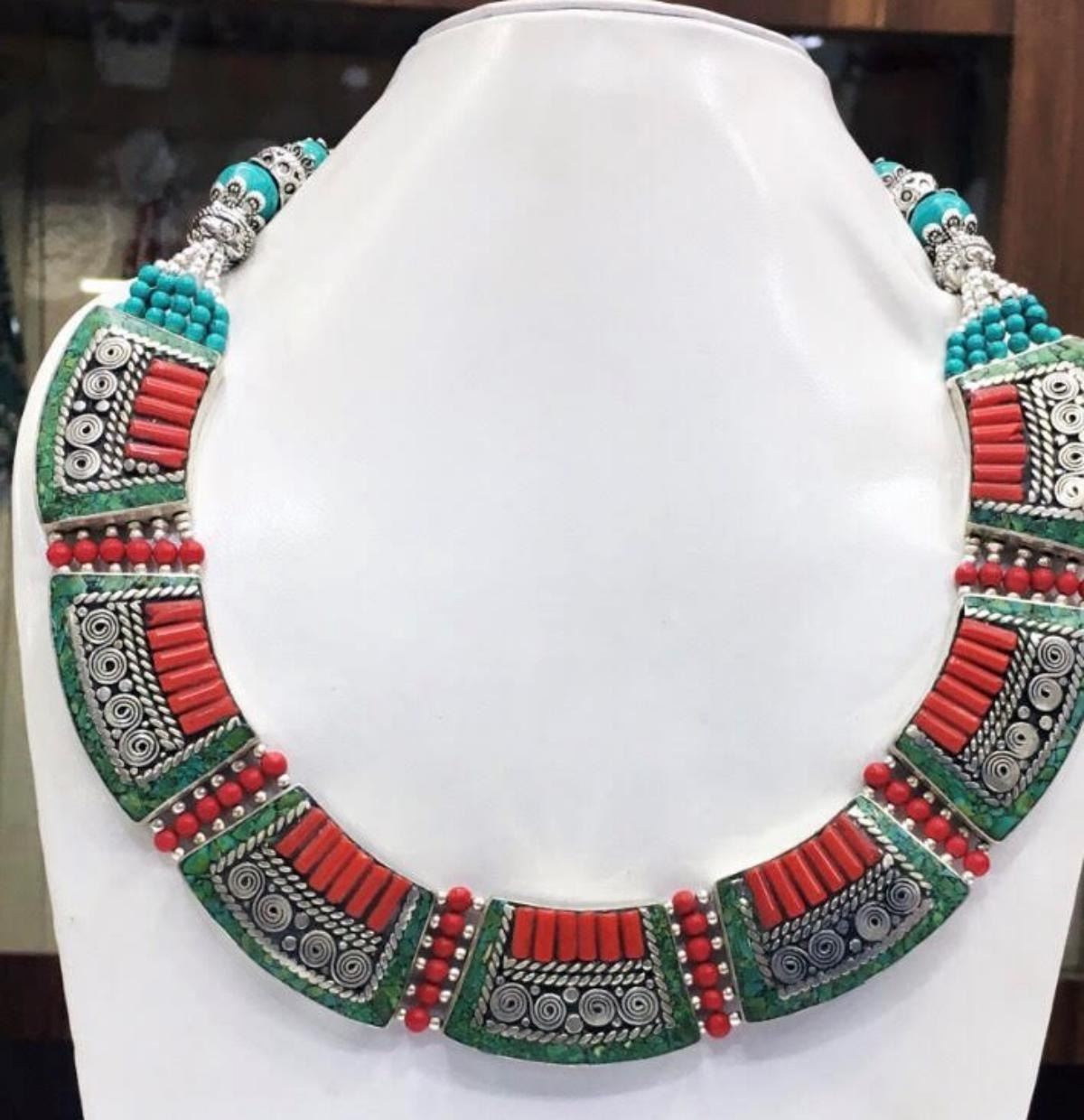 Tibet Natural Stone Hand Made Turquoise, Coral Necklace......;This elegant large Necklace was handcrafted in Tibet, the home of exquisite jewelry craftsmanship. It was skillfully made with large natural Turquoise, each in a deep Tibetan Silver setting. and balance the design perfectly. Turquoise is used virtually worldwide for jewelry making, and is highly prized for its brilliant colors, which vary from mine to mine. The distinctive webbing patterns and variations of color in the stones on this wonderful piece are typical of the natural Turquoise found throughout much of the Himalayan region, where Turquoise has been used in jewelry-making since centuries.”””Note- All stones in this necklace are Natural.....Guaranteed....Vintage look but necklace is brand new.
