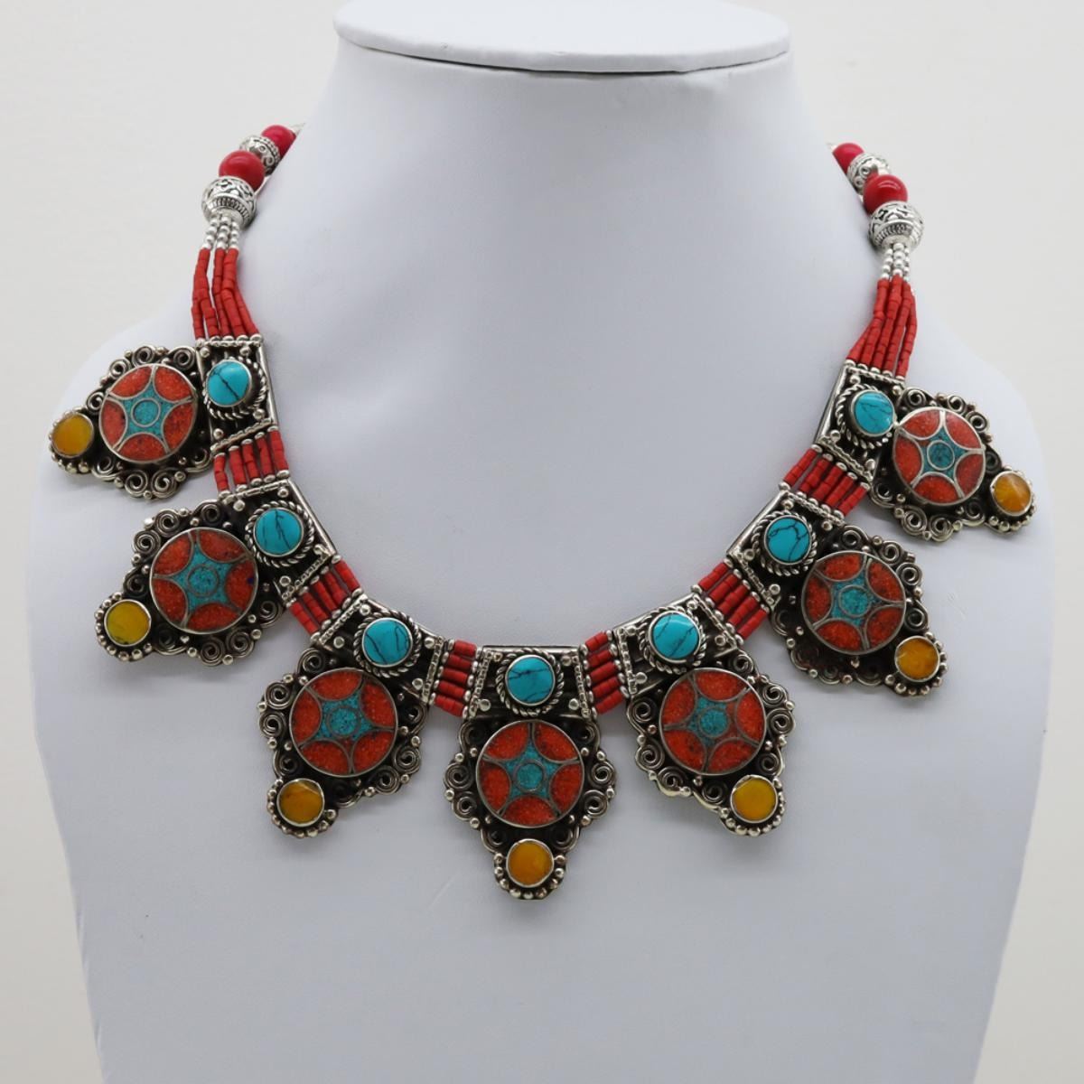 Tibet Natural Stone Hand Made Turquoise, Coral Necklace......;This elegant large Necklace was handcrafted in Tibet, the home of exquisite jewelry craftsmanship. It was skillfully made with large natural Turquoise, each in a deep Tibetan Silver setting. and balance the design perfectly. Turquoise is used virtually worldwide for jewelry making, and is highly prized for its brilliant colors, which vary from mine to mine. The distinctive webbing patterns and variations of color in the stones on this wonderful piece are typical of the natural Turquoise found throughout much of the Himalayan region, where Turquoise has been used in jewelry-making since centuries.