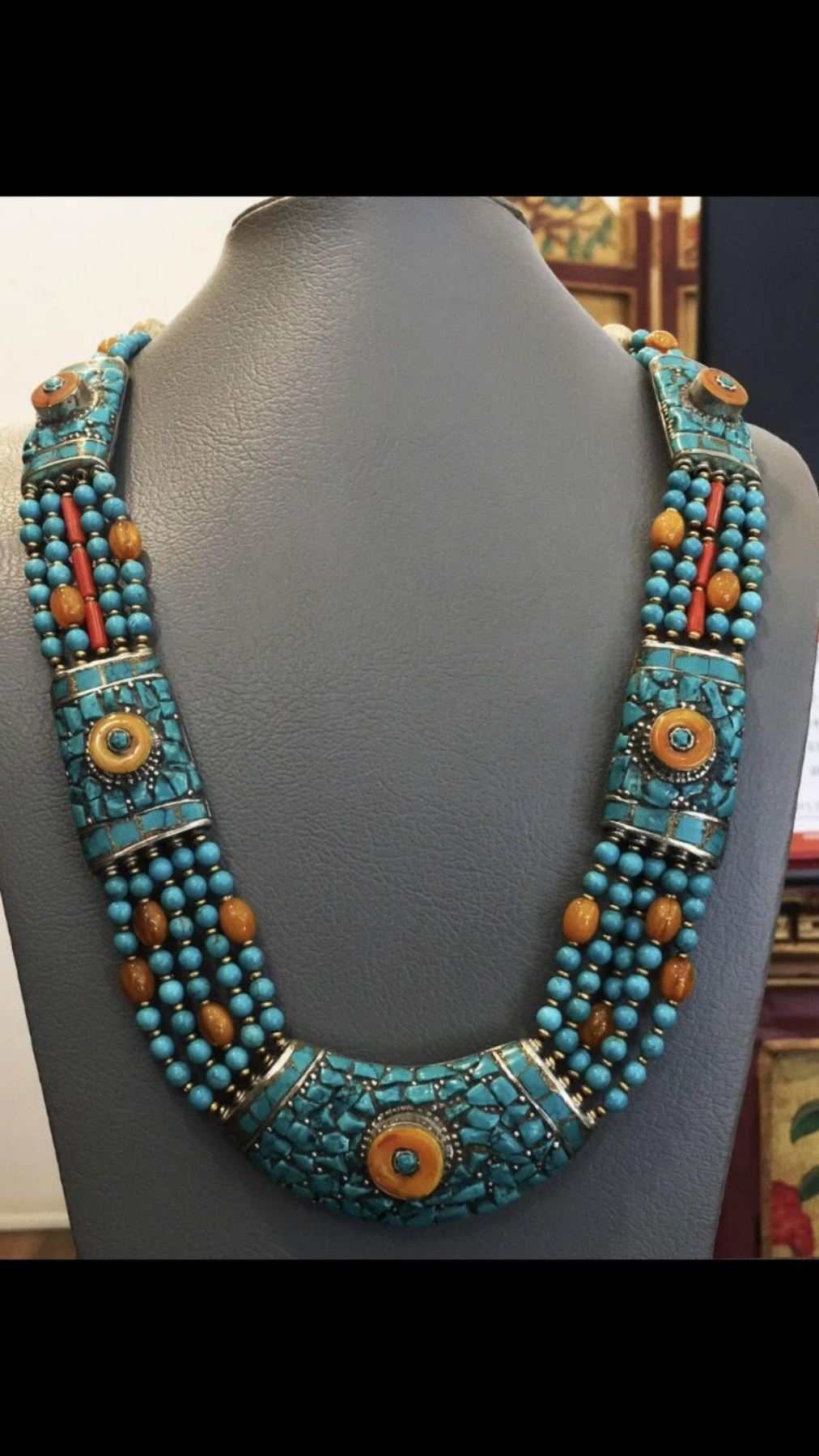 Tibet Natural Stone Hand Made Turquoise.....;This elegant large Necklace was handcrafted in Tibet, the home of exquisite jewelry craftsmanship. It was skillfully made with large natural Turquoise, each in a deep Tibetan Silver setting. and balance the design perfectly. Turquoise is used virtually worldwide for jewelry making, and is highly prized for its brilliant colors, which vary from mine to mine. The distinctive webbing patterns and variations of color in the stones on this wonderful piece are typical of the natural Turquoise found throughout much of the Himalayan region, where Turquoise has been used in jewelry-making since centuries.”””Note- All stones in this necklace are Natural.....Guranteed....Vintage look but necklace is brand new.(Handcrafted and Made in Tibet)