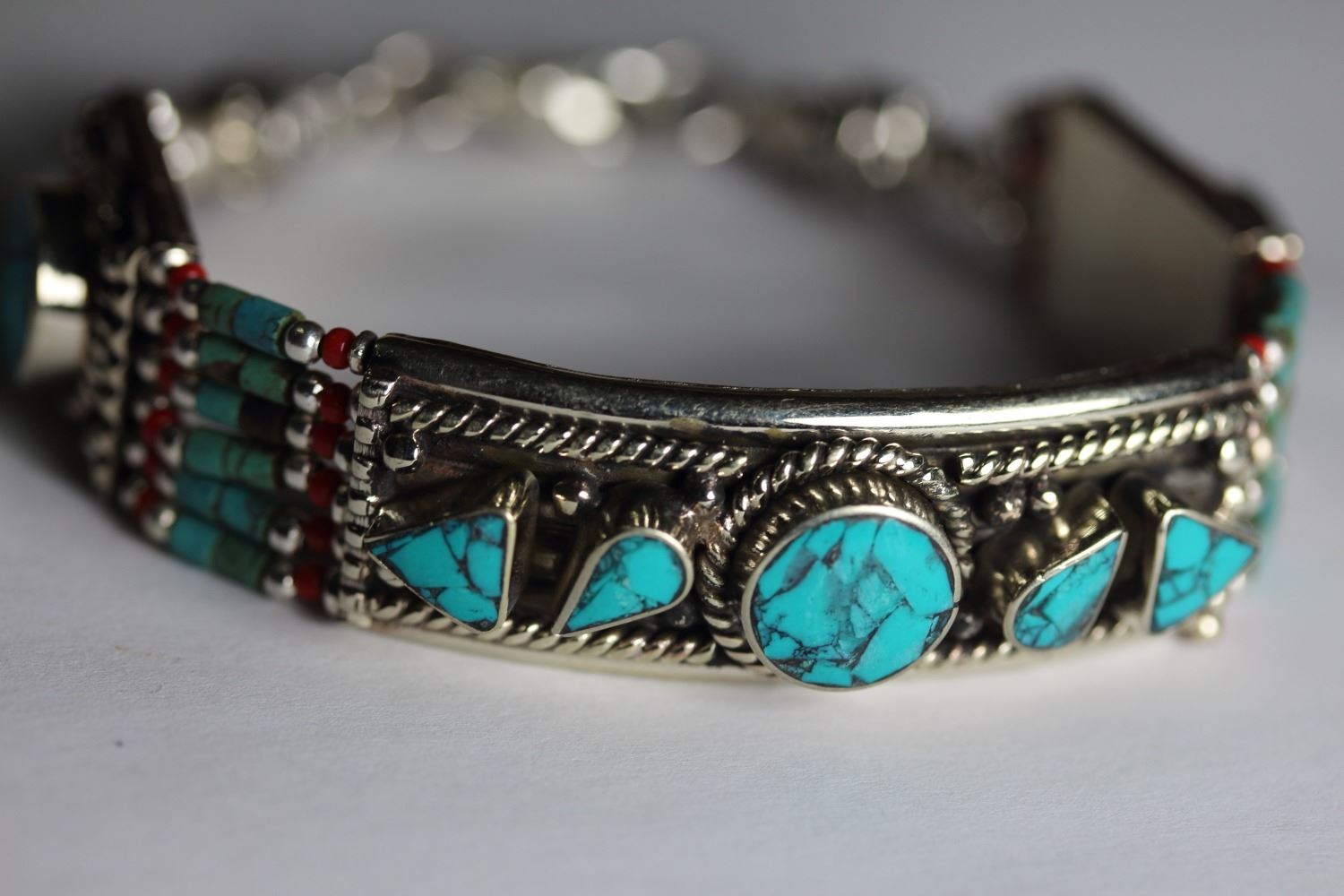 Tibet Natural Stone Hand Made Turquoise, Bracelet.......This elegant large Bracelet was handcrafted in Tibet, the home of exquisite jewelry craftsmanship. It was skillfully made with natural Turquoise, each in a deep Tibetan Silver setting. and balance the design perfectly. Turquoise is used virtually worldwide for jewelry making, and is highly prized for its brilliant colors, which vary from mine to mine. The distinctive webbing patterns and variations of color in the stones on this wonderful piece are typical of the natural Turquoise found throughout much of the Himalayan region, where Turquoise has been used in jewelry-making since centuries. - All stones in this Bracelet are Natural.....Guranteed....Vintage look but Bracelet is brand new.