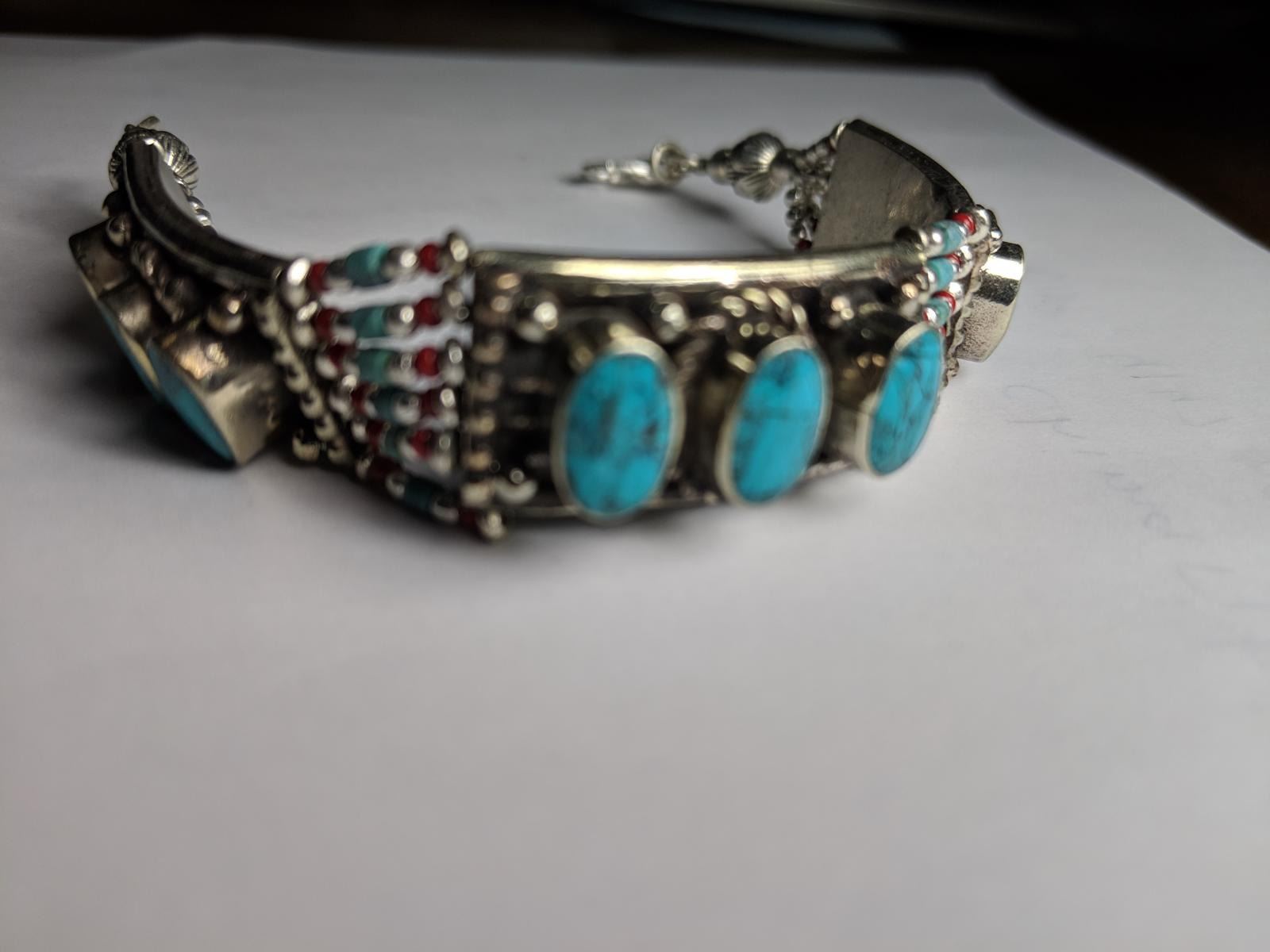 Tibet Natural Stone Hand Made Turquoise Bracelet.......This elegant large Bracelet was handcrafted in Tibet, the home of exquisite jewelry craftsmanship. It was skillfully made with natural Turquoise, each in a deep Tibetan Silver setting. and balance the design perfectly. Turquoise is used virtually worldwide for jewelry making, and is highly prized for its brilliant colors, which vary from mine to mine. The distinctive webbing patterns and variations of color in the stones on this wonderful piece are typical of the natural Turquoise found throughout much of the Himalayan region, where Turquoise has been used in jewelry-making since centuries.”””Note- All stones in this Bracelet are Natural.....Guaranteed....Vintage look but Bracelet is brand new.