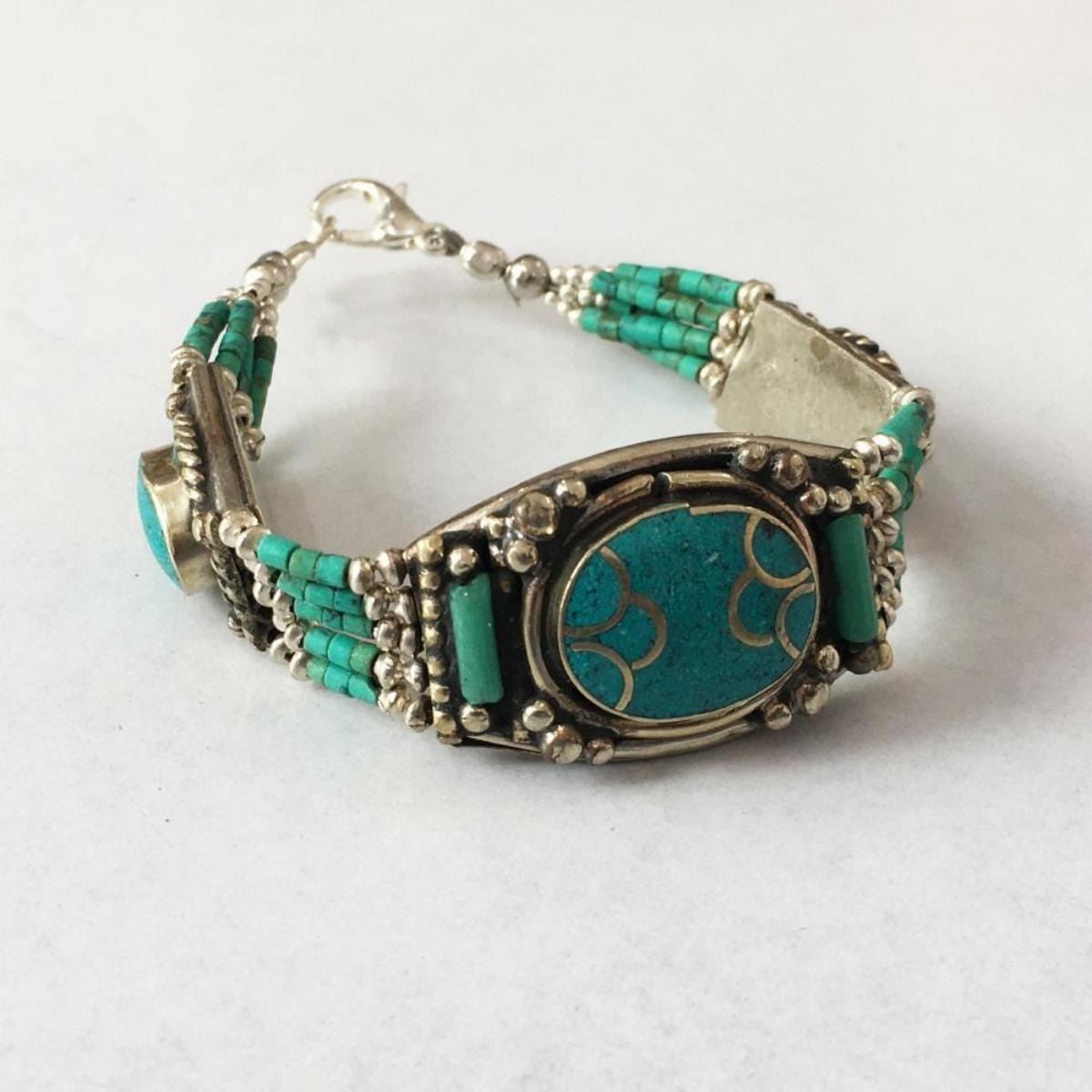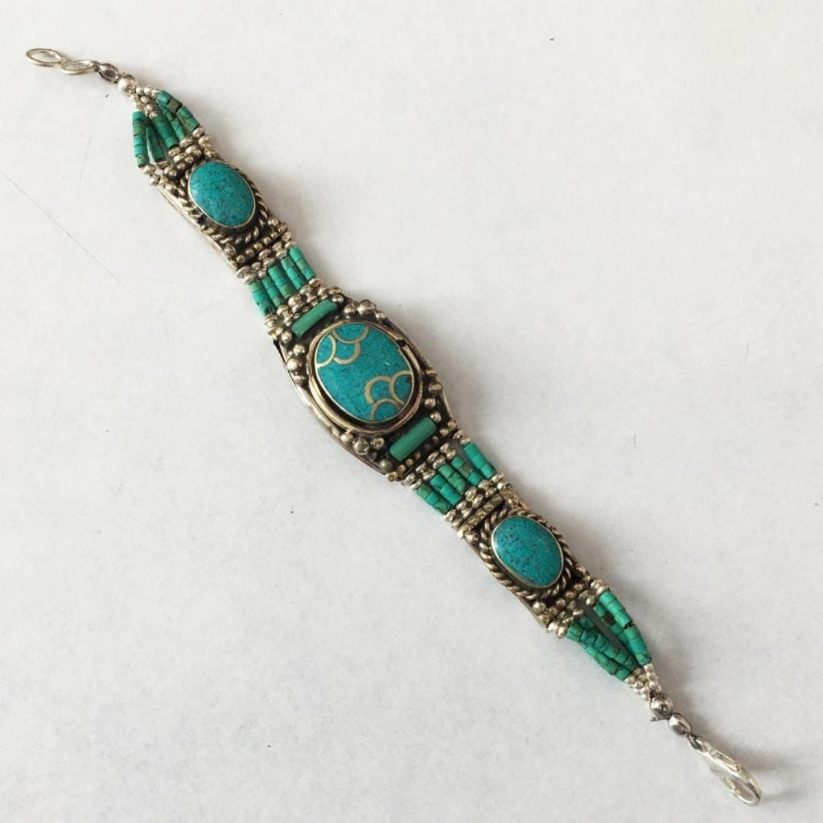 Tibet Natural Stone Hand Made Turquoise Bracelet.......This elegant large Bracelet was handcrafted in Tibet, the home of exquisite jewelry craftsmanship. It was skillfully made with natural Lapiz Lazuli, each in a deep Tibetan Silver setting. and balance the design perfectly. Turquoise is used virtually worldwide for jewelry making, and is highly prized for its brilliant colors, which vary from mine to mine. The distinctive webbing patterns and variations of color in the stones ..Vintage look but Bracelet is brand new.