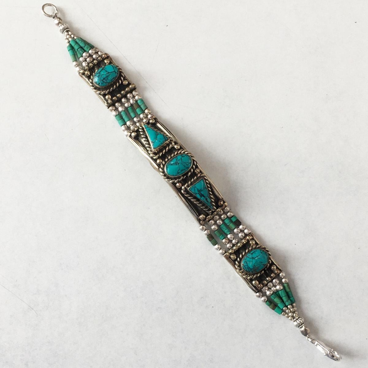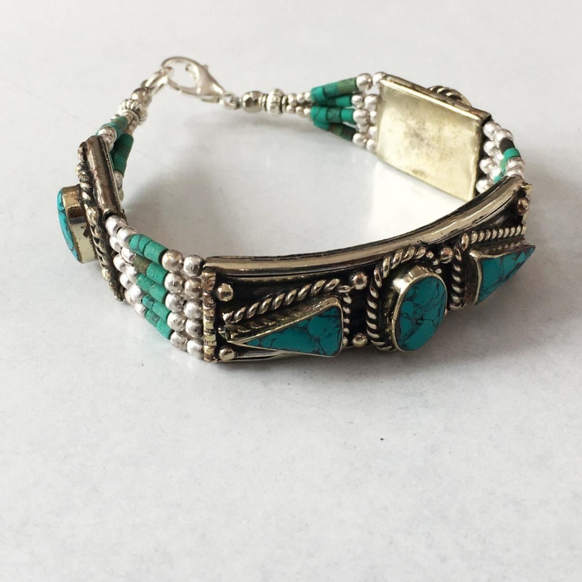 Tibet Natural Stone Hand Made Turquoise Bracelet.......This elegant large Bracelet was handcrafted in Tibet, the home of exquisite jewelry craftsmanship. It was skillfully made with natural Lapiz Lazuli, each in a deep Tibetan Silver setting. and balance the design perfectly. Turquoise is used virtually worldwide for jewelry making, and is highly prized for its brilliant colors, which vary from mine to mine. The distinctive webbing patterns and variations of color in the stones ..Vintage look but Bracelet is brand new.