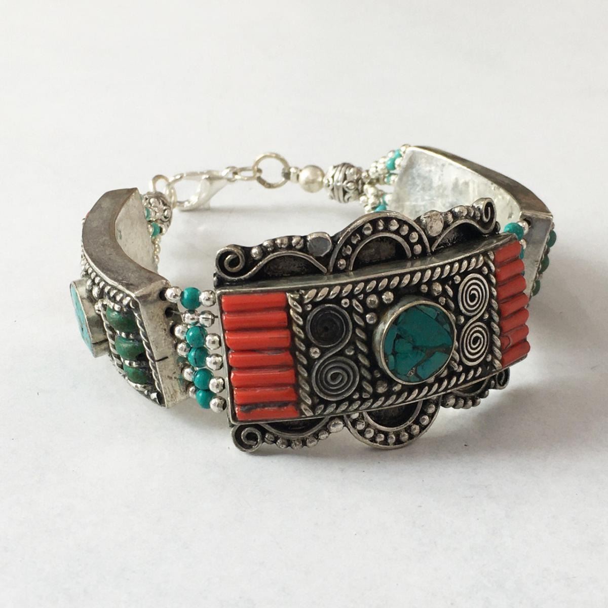 Tibet Natural Stone Hand Made Turquoise Bracelet.......This elegant large Bracelet was handcrafted in Tibet, the home of exquisite jewelry craftsmanship. It was skillfully made with natural Lapiz Lazuli, each in a deep Tibetan Silver setting. and balance the design perfectly. Turquoise is used virtually worldwide for jewelry making, and is highly prized for its brilliant colors, which vary from mine to mine. The distinctive webbing patterns and variations of color in the stones ..Vintage look but Bracelet is brand new.