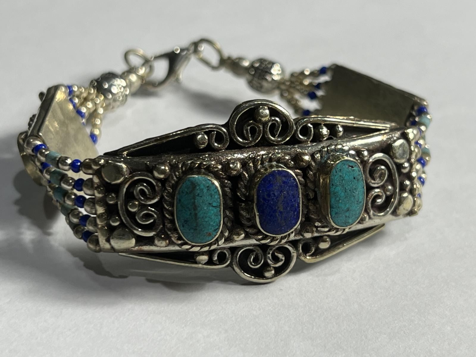 Tibet Natural Stone Hand Made Turquoise Bracelet.......This elegant large Bracelet was handcrafted in Tibet, the home of exquisite jewelry craftsmanship. It was skillfully made with natural Lapiz Lazuli, each in a deep Tibetan Silver setting. and balance the design perfectly. Turquoise is used virtually worldwide for jewelry making, and is highly prized for its brilliant colors, which vary from mine to mine. The distinctive webbing patterns and variations of color in the stones ..Vintage look but Bracelet is brand new.