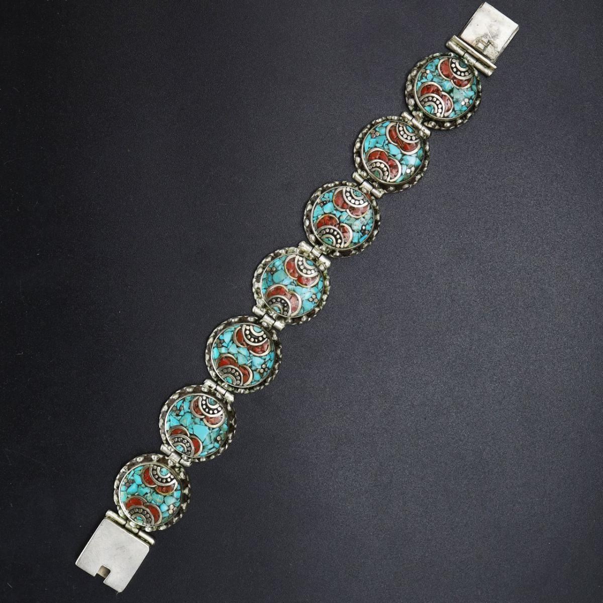 Tibet Natural Stone Hand Made Turquoise Bracelet.......This elegant large Bracelet was handcrafted in Tibet, the home of exquisite jewelry craftsmanship. It was skillfully made with natural Turquoise & Coral , each in a deep Tibetan Silver setting. and balance the design perfectly. Turquoise is used virtually worldwide for jewelry making, and is highly prized for its brilliant colors, which vary from mine to mine. The distinctive webbing patterns and variations of color in the stones ..Vintage look but Bracelet is brand new.