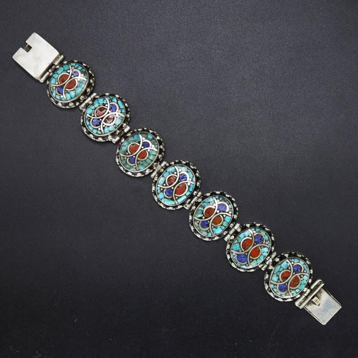 Tibet Natural Stone Hand Made Turquoise Bracelet.......This elegant large Bracelet was handcrafted in Tibet, the home of exquisite jewelry craftsmanship. It was skillfully made with natural Turquoise Lapiz Lazuli & Coral , each in a deep Tibetan Silver setting. and balance the design perfectly. Turquoise is used virtually worldwide for jewelry making, and is highly prized for its brilliant colors, which vary from mine to mine. The distinctive webbing patterns and variations of color in the stones ..Vintage look but Bracelet is brand new.