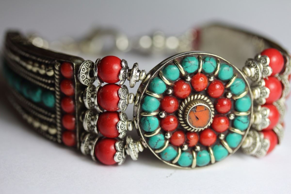 Tibet Natural Stone Hand Made Turquoise, Coral & Bracelet.......This elegant large Bracelet was handcrafted in Tibet, the home of exquisite jewelry craftsmanship. It was skillfully made with natural Turquoise, each in a deep Tibetan Silver setting. and balance the design perfectly. Turquoise is used virtually worldwide for jewelry making, and is highly prized for its brilliant colors, which vary from mine to mine. The distinctive webbing patterns and variations of color in the stones on this wonderful piece are typical of the natural Turquoise found throughout much of the Himalayan region, where Turquoise has been used in jewelry-making since centuries.”””Note- All stones in this Bracelet are Natural.....Guranteed....Vintage look but Bracelet is brand new.
