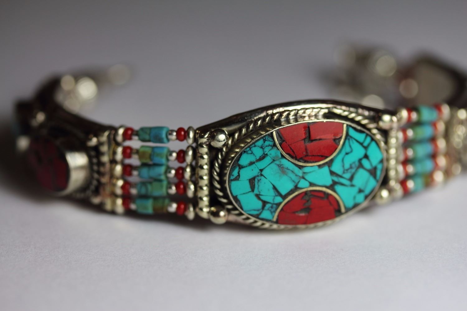 Tibet Natural Stone Hand Made Turquoise, Coral & Lapis Lazuli Bracelet.......This elegant large Bracelet was handcrafted in Tibet, the home of exquisite jewelry craftsmanship. It was skillfully made with natural Turquoise, each in a deep Tibetan Silver setting. and balance the design perfectly. Turquoise is used virtually worldwide for jewelry making, and is highly prized for its brilliant colors, which vary from mine to mine. The distinctive webbing patterns and variations of color in the stones on this wonderful piece are typical of the natural Turquoise found throughout much of the Himalayan region, where Turquoise has been used in jewelry-making since centuries.”””Note- All stones in this Bracelet are Natural.....Guranteed....Vintage look but Bracelet is brand new.