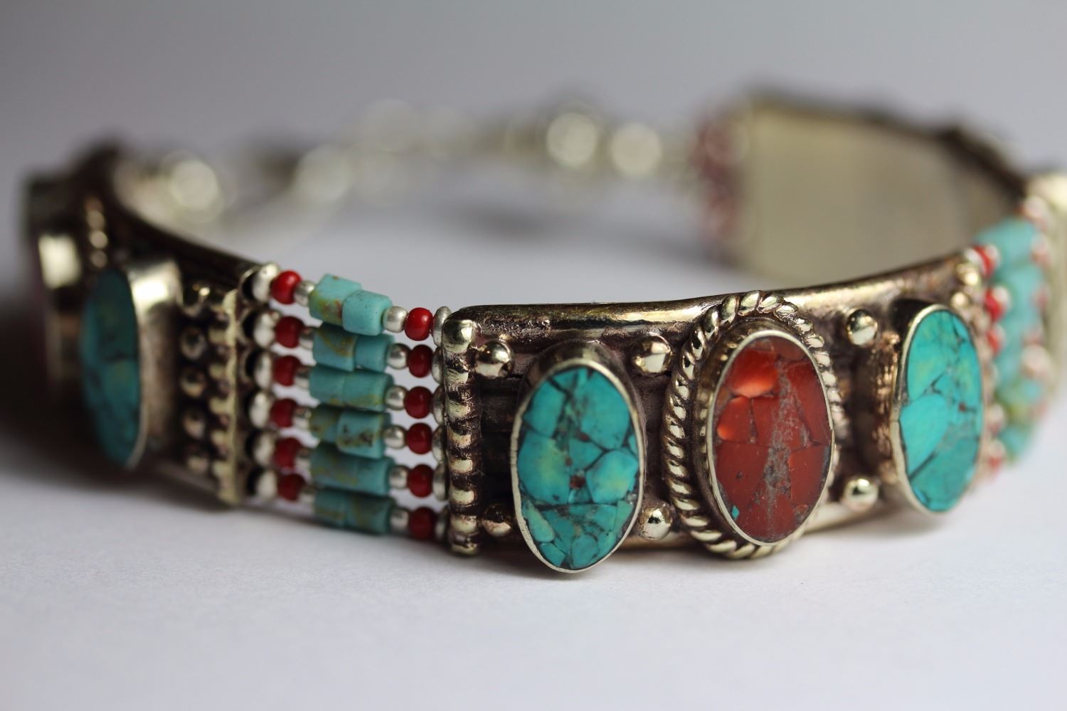 Tibet Natural Stone Hand Made Turquoise, Coral & Bracelet.......This elegant large Bracelet was handcrafted in Tibet, the home of exquisite jewelry craftsmanship. It was skillfully made with natural Turquoise, each in a deep Tibetan Silver setting. and balance the design perfectly. Turquoise is used virtually worldwide for jewelry making, and is highly prized for its brilliant colors, which vary from mine to mine. The distinctive webbing patterns and variations of color in the stones on this wonderful piece are typical of the natural Turquoise found throughout much of the Himalayan region, where Turquoise has been used in jewelry-making since centuries.”””Note- All stones in this Bracelet are Natural.....Guranteed....Vintage look but Bracelet is brand new.