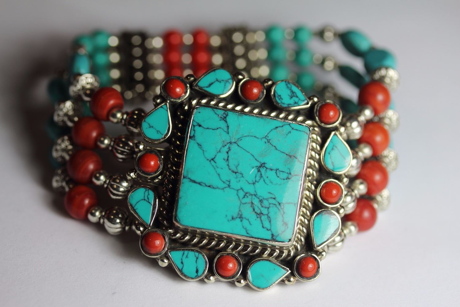 Tibet Natural Stone Hand Made Turquoise, Coral Bracelet.......This elegant large Bracelet was handcrafted in Tibet, the home of exquisite jewelry craftsmanship. It was skillfully made with natural Turquoise, each in a deep Tibetan Silver setting. and balance the design perfectly. Turquoise is used virtually worldwide for jewelry making, and is highly prized for its brilliant colors, which vary from mine to mine. The distinctive webbing patterns and variations of color in the stones on this wonderful piece are typical of the natural Turquoise found throughout much of the Himalayan region, where Turquoise has been used in jewelry-making since centuries.”””Note- All stones in this Bracelet are Natural.....Guranteed....Vintage look but Bracelet is brand new.