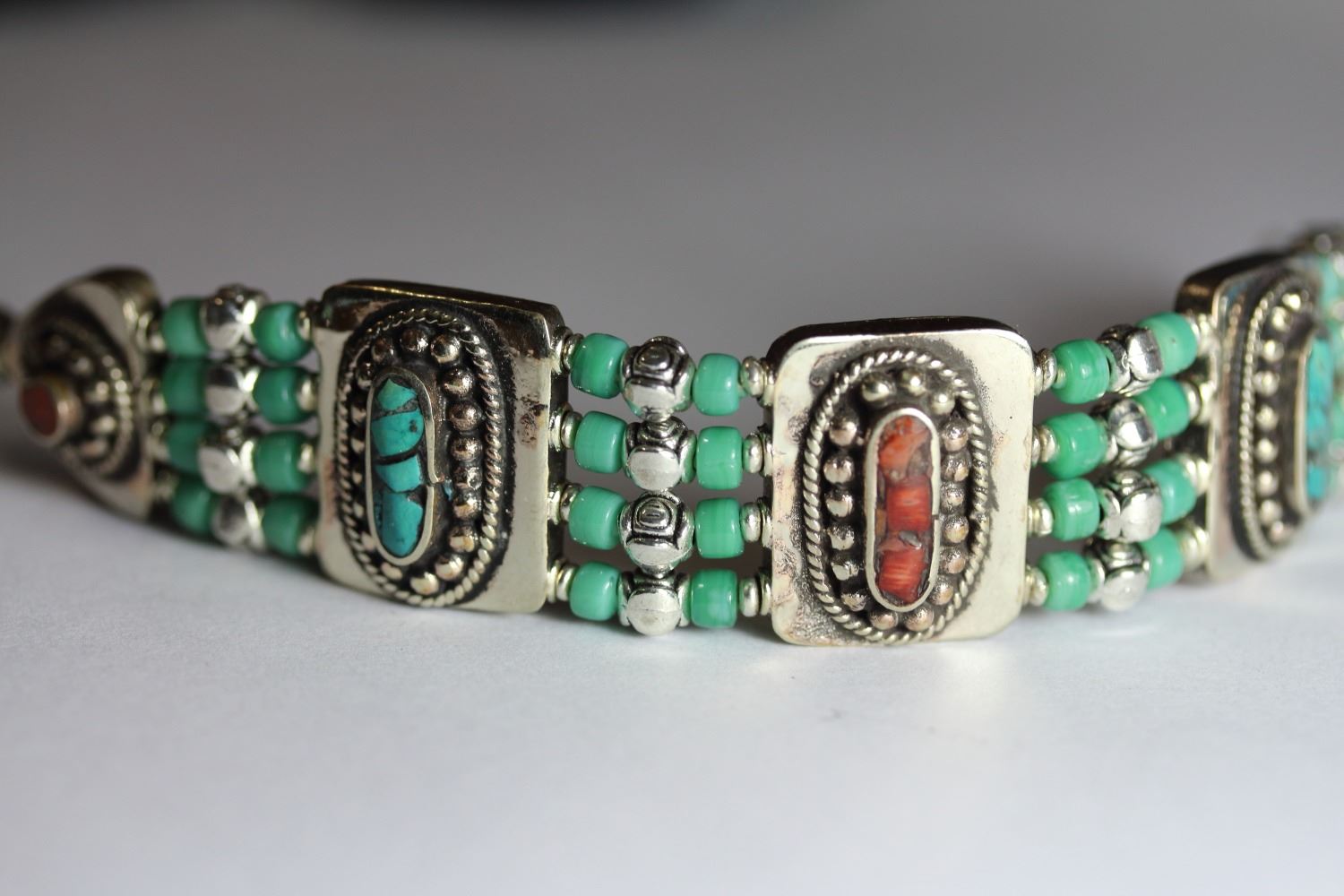 Tibet Natural Stone Hand Made Turquoise and Coral Bracelet.......This elegant large Bracelet was handcrafted in Tibet, the home of exquisite jewelry craftsmanship. It was skillfully made with natural Turquoise, each in a deep Tibetan Silver setting. and balance the design perfectly. Turquoise is used virtually worldwide for jewelry making, and is highly prized for its brilliant colors, which vary from mine to mine. The distinctive webbing patterns and variations of color in the stones on this wonderful piece are typical of the natural Turquoise found throughout much of the Himalayan region, where Turquoise has been used in jewelry-making since centuries.”””Note- All stones in this Bracelet are Natural.....Guranteed....Vintage look but Bracelet is brand new.