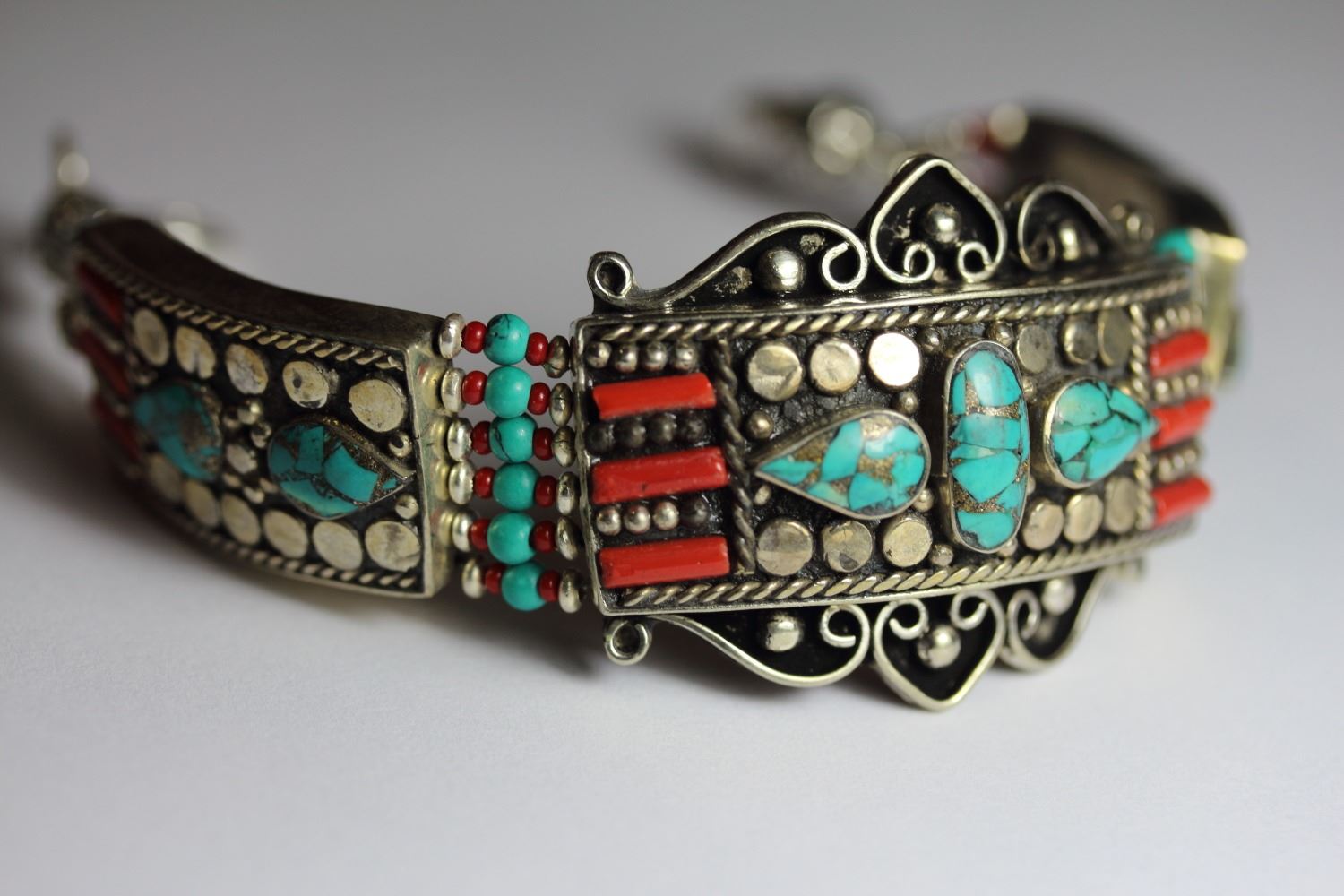 Tibet Natural Stone Hand Made Turquoise, Coral Bracelet.......This elegant large Bracelet was handcrafted in Tibet, the home of exquisite jewelry craftsmanship. It was skillfully made with natural Turquoise, each in a deep Tibetan Silver setting. and balance the design perfectly. Turquoise is used virtually worldwide for jewelry making, and is highly prized for its brilliant colors, which vary from mine to mine. The distinctive webbing patterns and variations of color in the stones on this wonderful piece are typical of the natural Turquoise found throughout much of the Himalayan region, where Turquoise has been used in jewelry-making since centuries.”””Note- All stones in this Bracelet are Natural.....Guranteed....Vintage look but Bracelet is brand new.