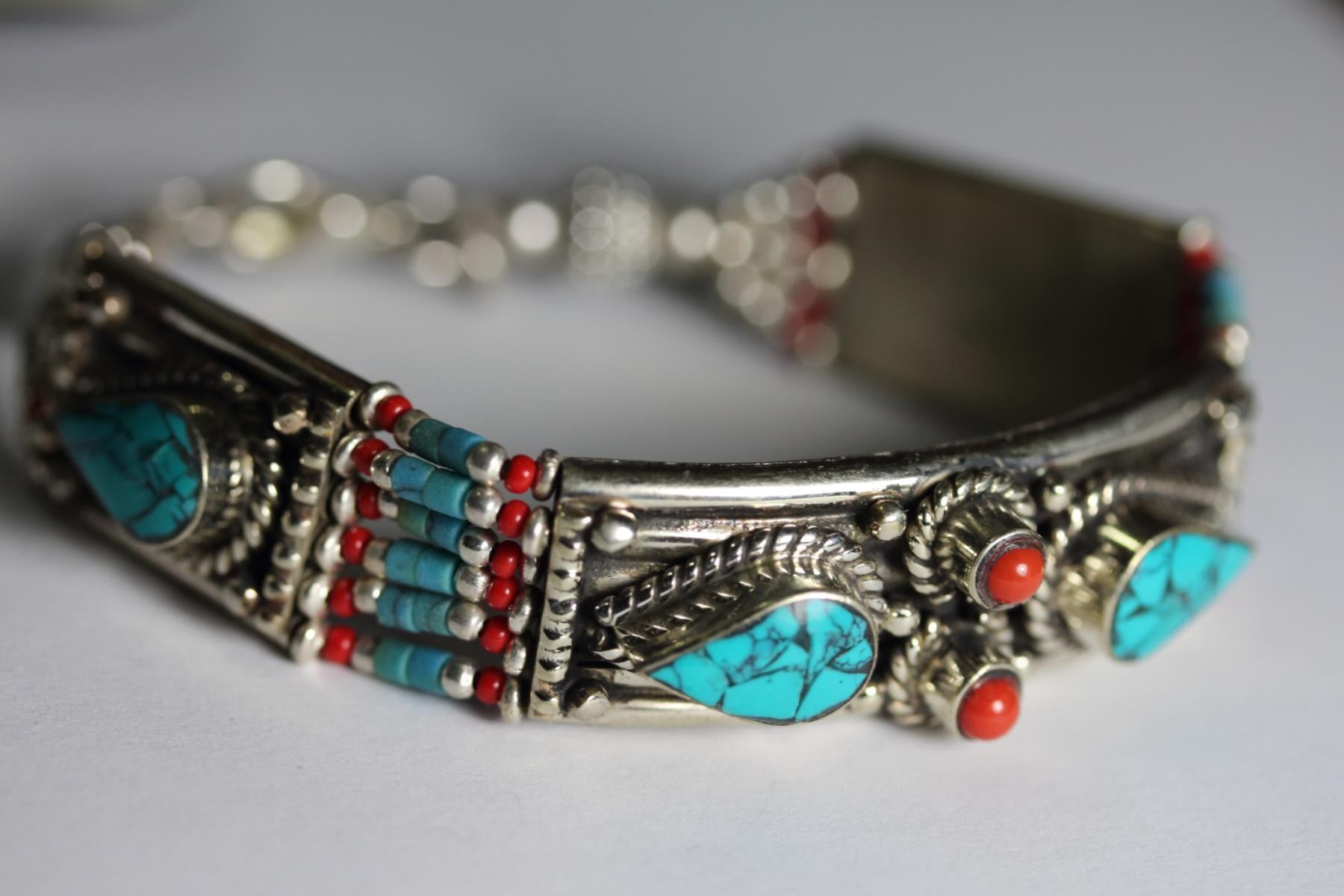 Tibet Natural Stone Hand Made Turquoise, Coral Bracelet.......This elegant large Bracelet was handcrafted in Tibet, the home of exquisite jewelry craftsmanship. It was skillfully made with natural Turquoise, each in a deep Tibetan Silver setting. and balance the design perfectly. Turquoise is used virtually worldwide for jewelry making, and is highly prized for its brilliant colors, which vary from mine to mine. The distinctive webbing patterns and variations of color in the stones on this wonderful piece are typical of the natural Turquoise found throughout much of the Himalayan region, where Turquoise has been used in jewelry-making since centuries.”””Note- All stones in this Bracelet are Natural.....Guaranteed....Vintage look but Bracelet is brand new.
