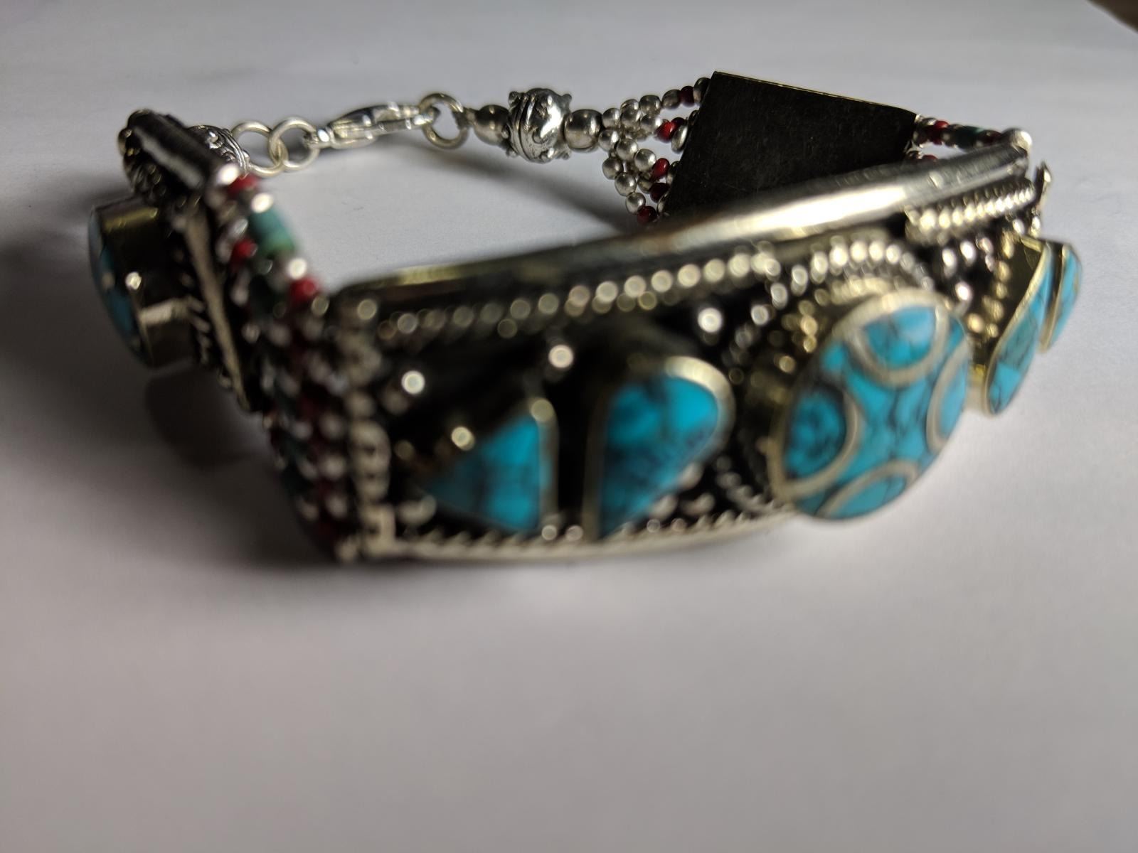 Tibet Natural Stone Hand Made Turquoise, coral Bracelet.......This elegant large Bracelet was handcrafted in Tibet, the home of exquisite jewelry craftsmanship. It was skillfully made with natural Turquoise, each in a deep Tibetan Silver setting. and balance the design perfectly. Turquoise is used virtually worldwide for jewelry making, and is highly prized for its brilliant colors, which vary from mine to mine. The distinctive webbing patterns and variations of color in the stones on this wonderful piece are typical of the natural Turquoise found throughout much of the Himalayan region, where Turquoise has been used in jewelry-making since centuries.”””Note- All stones in this Bracelet are Natural.....Guaranteed....Vintage look but Bracelet is brand new.