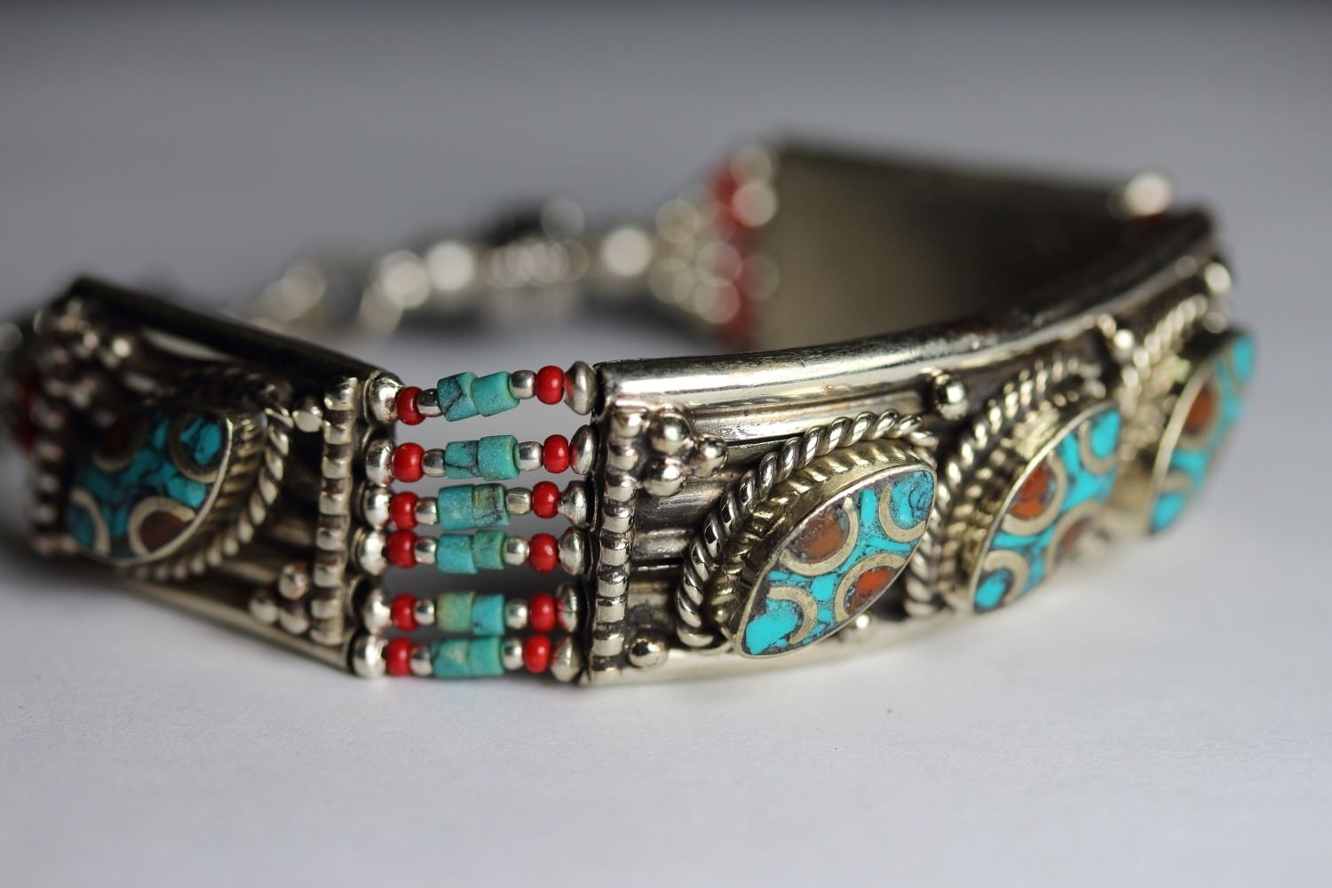 Tibet Natural Stone Hand Made Turquoise, Coral Bracelet.......This elegant large Bracelet was handcrafted in Tibet, the home of exquisite jewelry craftsmanship. It was skillfully made with natural Turquoise, each in a deep Tibetan Silver setting. and balance the design perfectly. Turquoise is used virtually worldwide for jewelry making, and is highly prized for its brilliant colors, which vary from mine to mine. The distinctive webbing patterns and variations of color in the stones on this wonderful piece are typical of the natural Turquoise found throughout much of the Himalayan region, where Turquoise has been used in jewelry-making since centuries.”””Note- All stones in this Bracelet are Natural.....Guaranteed....Vintage look but Bracelet is brand new.