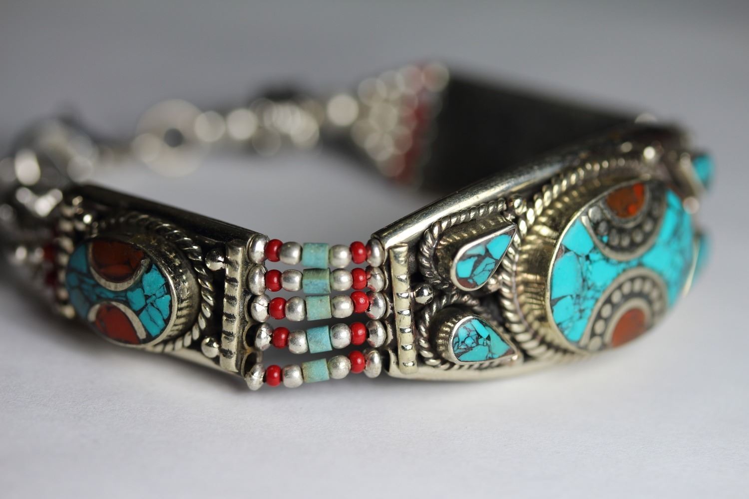 Tibet Natural Stone Hand Made Turquoise, Coral Bracelet.......This elegant large Bracelet was handcrafted in Tibet, the home of exquisite jewelry craftsmanship. It was skillfully made with natural Turquoise, each in a deep Tibetan Silver setting. and balance the design perfectly. Turquoise is used virtually worldwide for jewelry making, and is highly prized for its brilliant colors, which vary from mine to mine. The distinctive webbing patterns and variations of color in the stones on this wonderful piece are typical of the natural Turquoise found throughout much of the Himalayan region, where Turquoise has been used in jewelry-making since centuries.”””Note- All stones in this Bracelet are Natural.....Guaranteed....Vintage look but Bracelet is brand new.