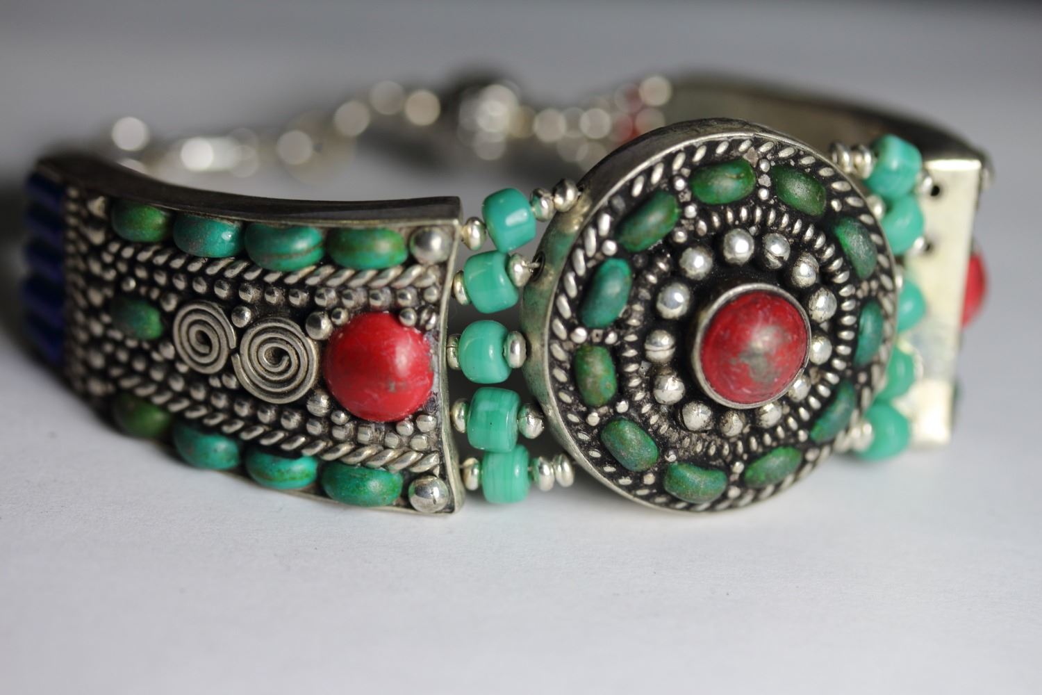 Tibet Natural Stone Hand Made Turquoise, coral Bracelet.......This elegant large Bracelet was handcrafted in Tibet, the home of exquisite jewelry craftsmanship. It was skillfully made with natural Turquoise, each in a deep Tibetan Silver setting. and balance the design perfectly. Turquoise is used virtually worldwide for jewelry making, and is highly prized for its brilliant colors, which vary from mine to mine. The distinctive webbing patterns and variations of color in the stones on this wonderful piece are typical of the natural Turquoise found throughout much of the Himalayan region, where Turquoise has been used in jewelry-making since centuries.”””Note- All stones in this Bracelet are Natural.....Guaranteed....Vintage look but Bracelet is brand new.