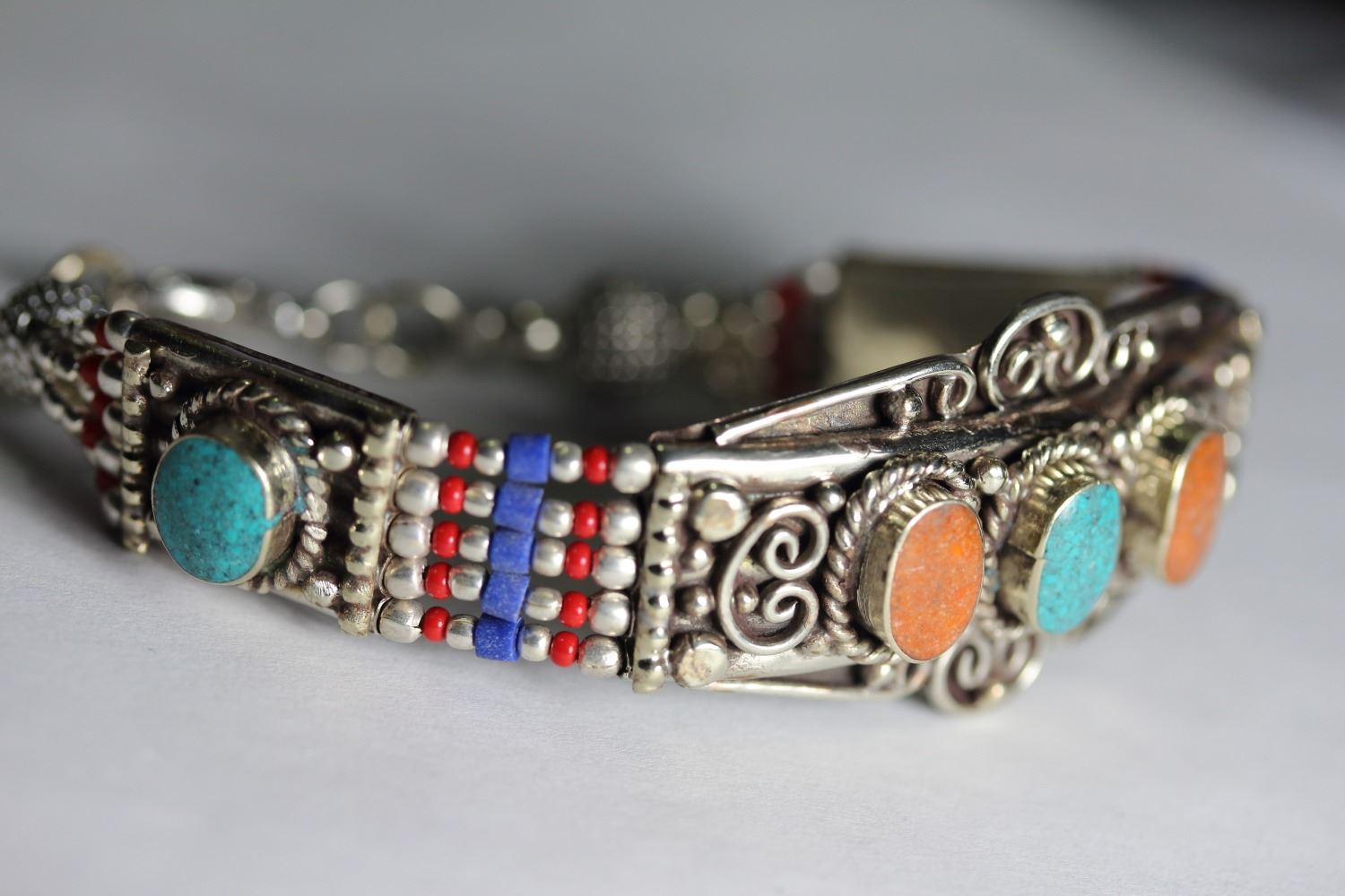 Tibet Natural Stone Hand Made Turquoise, Coral Bracelet.......This elegant large Bracelet was handcrafted in Tibet, the home of exquisite jewelry craftsmanship. It was skillfully made with natural Turquoise, each in a deep Tibetan Silver setting. and balance the design perfectly. Turquoise is used virtually worldwide for jewelry making, and is highly prized for its brilliant colors, which vary from mine to mine. The distinctive webbing patterns and variations of color in the stones on this wonderful piece are typical of the natural Turquoise found throughout much of the Himalayan region, where Turquoise has been used in jewelry-making since centuries.”””Note- All stones in this Bracelet are Natural.....Guaranteed....Vintage look but Bracelet is brand new.